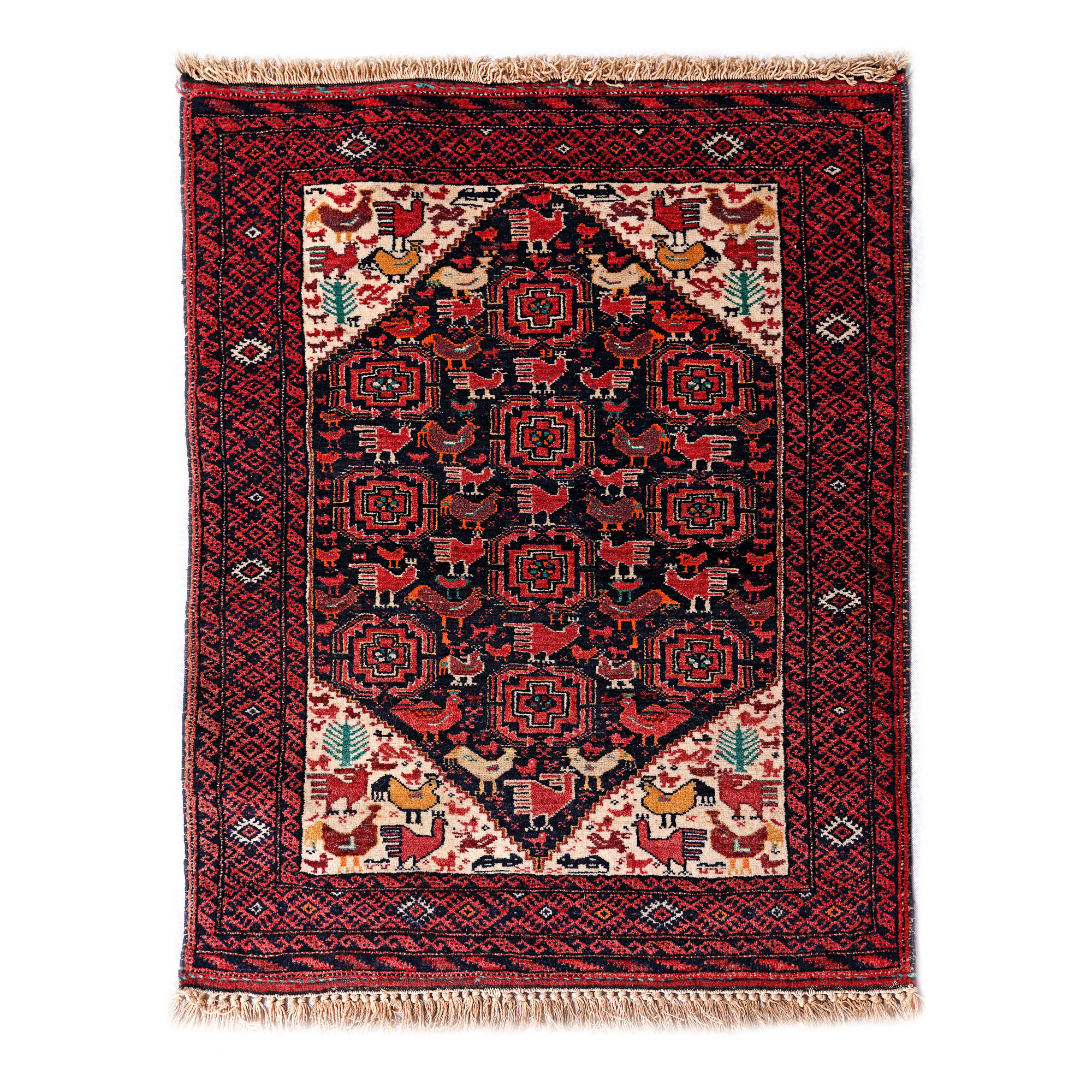 46. Covor Luri din lână, decorat cu cocoși, Iran, mijlocul sec. XX