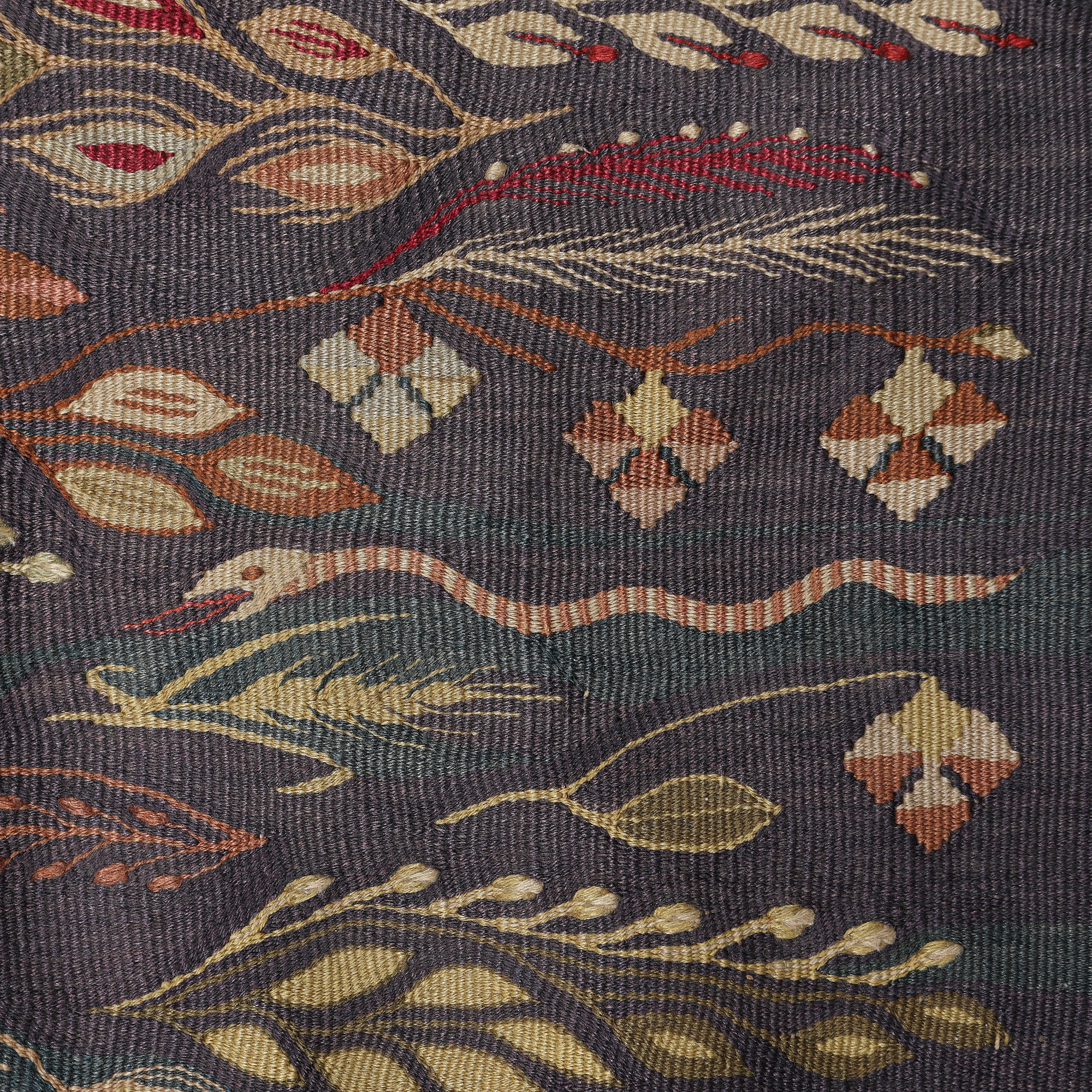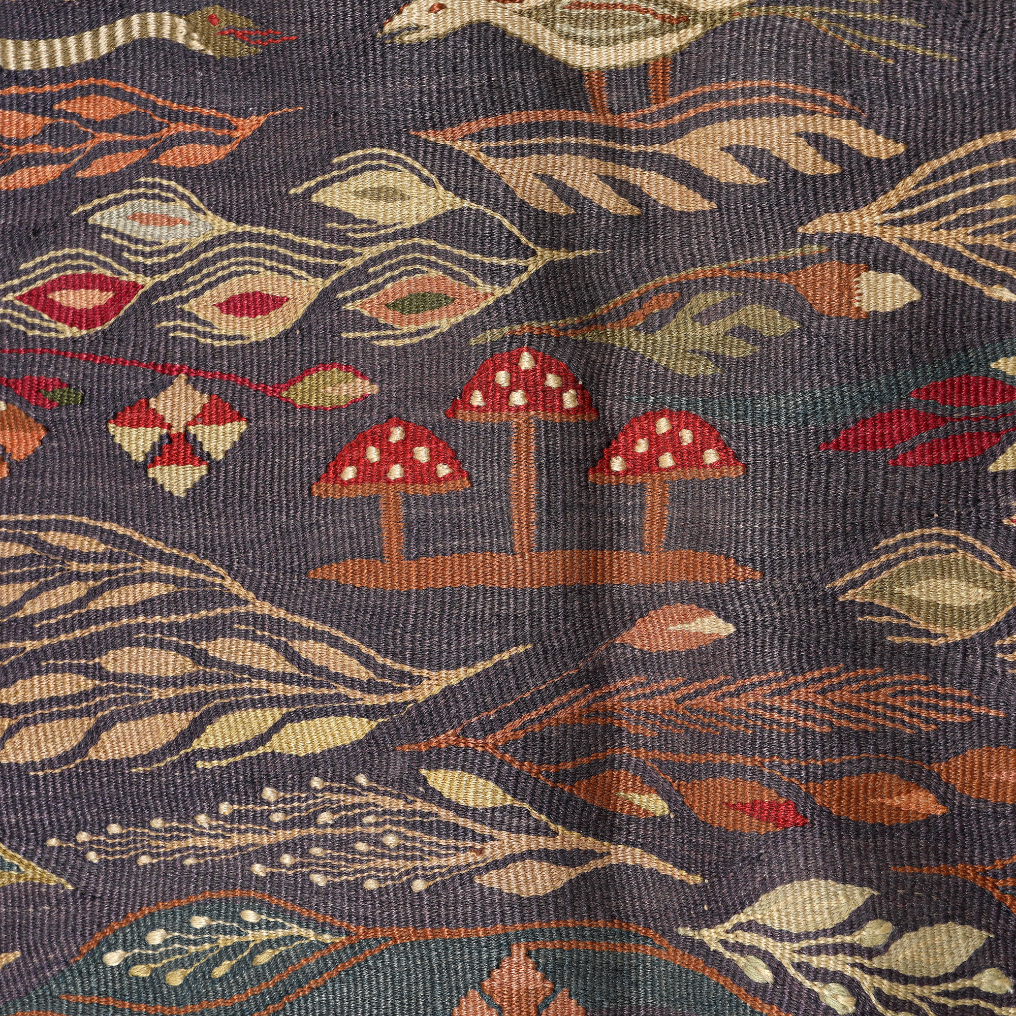 17. Important covor oltenesc din lână, decorat cu elemente vegetale, păsări, șerpi, ciuperci și o țărăncuță, începutul sec. XX, piesă rară, de colecție