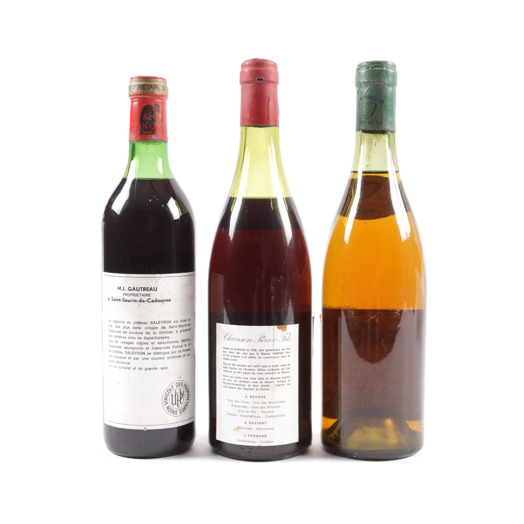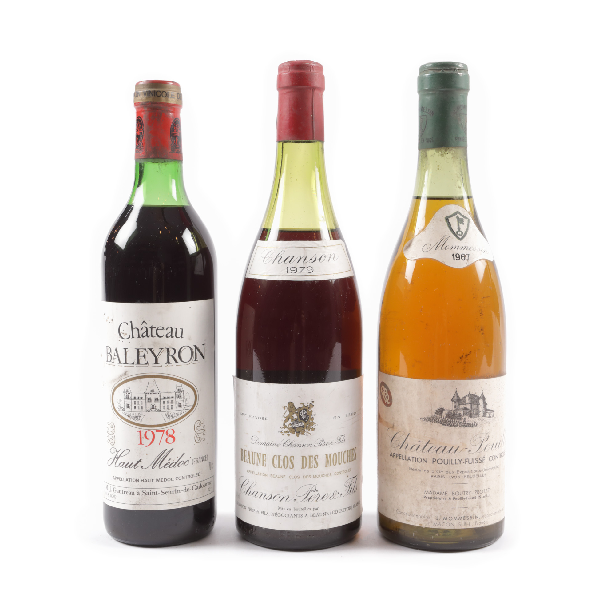 Château Pouilly, Pouilly Fuissé, 1967, 1st x 0,75l Château Baleyron, Haut-Médoc, 1978, 1st x 0,70l Chanson Père et Fils, Beaune Clos des Mouches, 1979, 1st x 0,73l