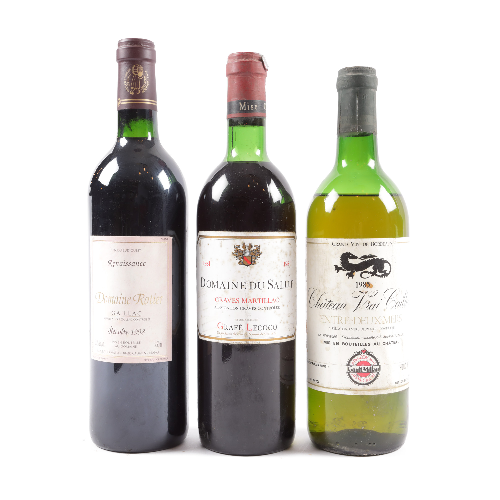 Domaine du Salut, Graves Martillac, 1981, 1st x 0,70l Chateau Vrai Caillou, Entre-Deux-Mers, 1985, 1st x 0,75l Domaine Rotier, Gaillac, 1998, 1st x 0,75l