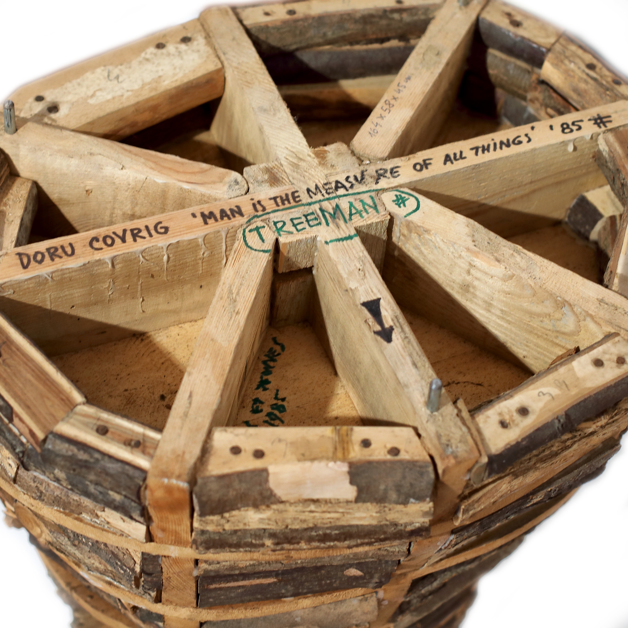 semnat, datat și intitulat în interior, cu negru, "Doru Covrig, Man Is the Measure of All Things, (19)85" notat cu verde, în interior, "Treeman, Grands et Jeunes, (19)85";