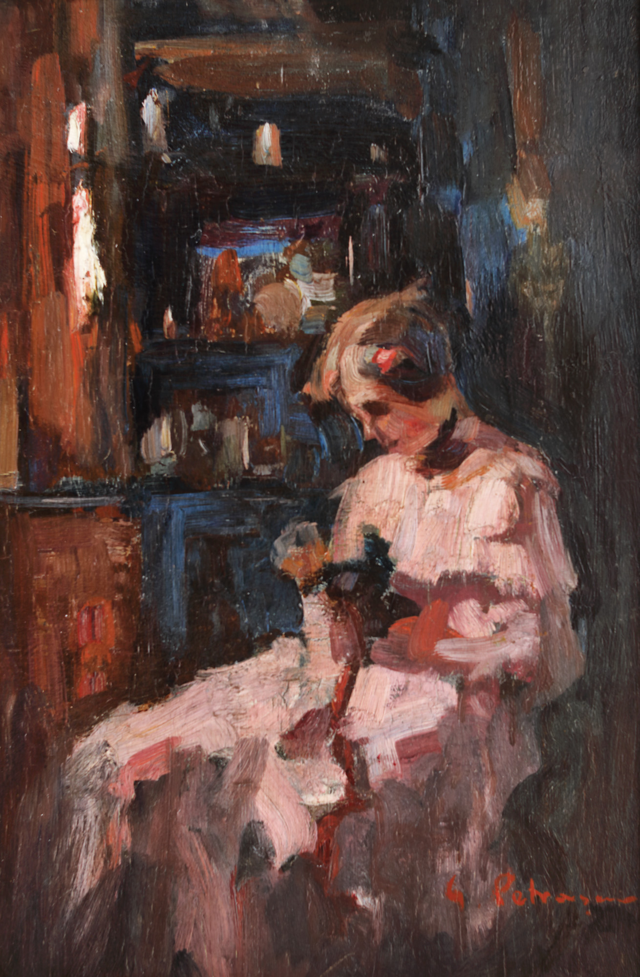 Pictura de interior a reprezentat unul dintre genurile picturale în care Petrașcu a preluat o temă clasică, dar a reinterpretat-o fie prin maniera inedită de punere a culorii, fie datorită modalității de organizare a spațiului. Atras în special de specificitatea propriului interior, care se confundă cu atelierul, artistul concepe un ciclu profund, din care ne parvine și uleiul de față. Atras de o compoziție coordonată de un plan restrâns, controlabil din punct de vedere al perspectivei, pictorul a început să introducă interiorul în perioada 1912-1914, când apar și primele uleiuri cu personaje în acest spațiu predefinit. “Femeie în atelier” - 1912 (M.N.A.R., inv. 7827) sau “Femeie în atelier” (M.N.A.R., inv. 7848). Fără să ne referim aici la natura statică, care ține de o altă tipologie estetică, interiorul lui Petrașcu este astăzi - alături de aceeași tematică lucrată de Pallady - una dintre cele mai reprezentative manifestări artistice ale artei românești. (I.P.)