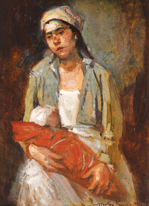 Considerat de critica vremii ca fiind - în opoziție cu Grigorescu - ”pictorul vieții de la oraș”, Nicolae Vermont zugrăvește scene de cafenea, interioare de case sau scene de familie cu un puternic caracter impresionist. În opera sa, el urmărește obținerea de efecte psihologice prin organizarea compozițională și trece, succesiv, prin particularitățile impresionismului german și ale celui francez. Motivul maternității va fi reluat în repetate rânduri de către Vermont, atât în pictură, cât și în desen. Subiectul apare în jurul anului 1898, atunci când artistul expune ”Botezul”, lucrare centrată în jurul unui grup de femei reunit în preajma mamei care își ține pruncul în brațe. În opera de față ne întâmpină un cadru intim, al căminului luminos și primitor atins de razele soarelui. Distingem elemente precum oglinda, care ne-o destăinuie pe mamă atât în postura privitorului care își veghează pruncul, cât și în postura celui ce e privit; tablourile care decorează pereții, buchetul de flori sau plantele verzi care conferă căldură cadrului familiar. Vermont își abordează personajele cu gingășie și naturalețe, transferând parcă toată strălucirea solară în paleta sa cromatică. (D.C.)