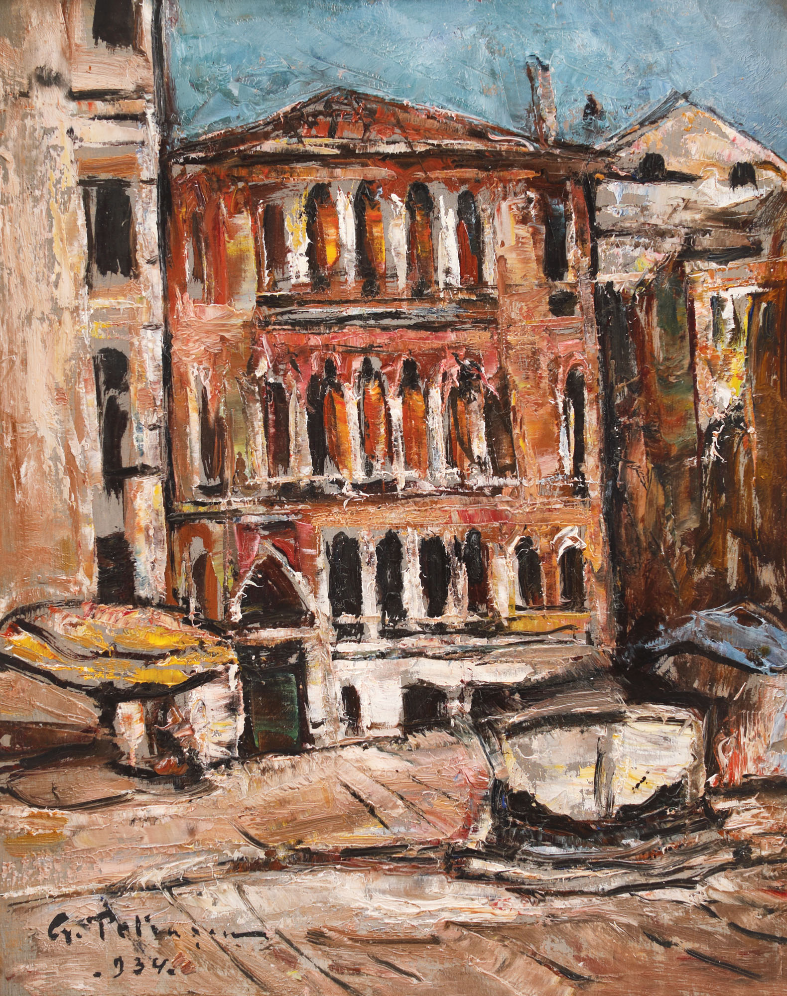 Cu o bogăție cromatică sobră și lirică prin substratul grav, arta lui Petrașcu ne dezvăluie universul său intim, în cadrul căruia vom întâlni periodic și peisajul citadin, gen căruia îi va acorda o mare atenție încă de la început. Printre locurile de care va rămâne profund impresionat în peregrinările sale juvenile - Londra, Haga, Amsterdam, Berlin, München, Viena, Bruxelles, Senlis, Zürich, Berna, Basel, Stokholm Toledo) – Veneția se va afla printre locurile mult îndrăgite. O va descoperi în anul 1902, cu ocazia unei călătorii pe care o întreprinde aici iar începând cu acest an va continua să revină cu entuziasm în nenumărate rânduri. Va rămâne profund impresionat de priveliștile panoramice ale Palatului Dogilor, Palatului Ca' d'Oro, Podului Rialto, Catedralei San Marco sau ale semețului Campanile, precum și de arta marilor maeștri - Rembrandt, Rubens, Tizian sau Velasques. Solitar și tăcut, artistul va străbate aceste locuri care îl vor inspira, impregnându-se de climatul acestora, petrecând timp în apropierea lor pentru a le înțelege, încorporându-le spiritului său, pentru a le reda apoi așa cum le simțea. Cu elementele care i le va procura cetatea, Petrașcu va construi un oraș nou, cuceritor și realist, ceva mai material și cântărind mai greu, cu ceruri mai puțin transparente, palete mai întunecate păstrate în ziduri sângerii - trăsături ce vor plăsmui o Veneție care îi va aparține. (G.M.)