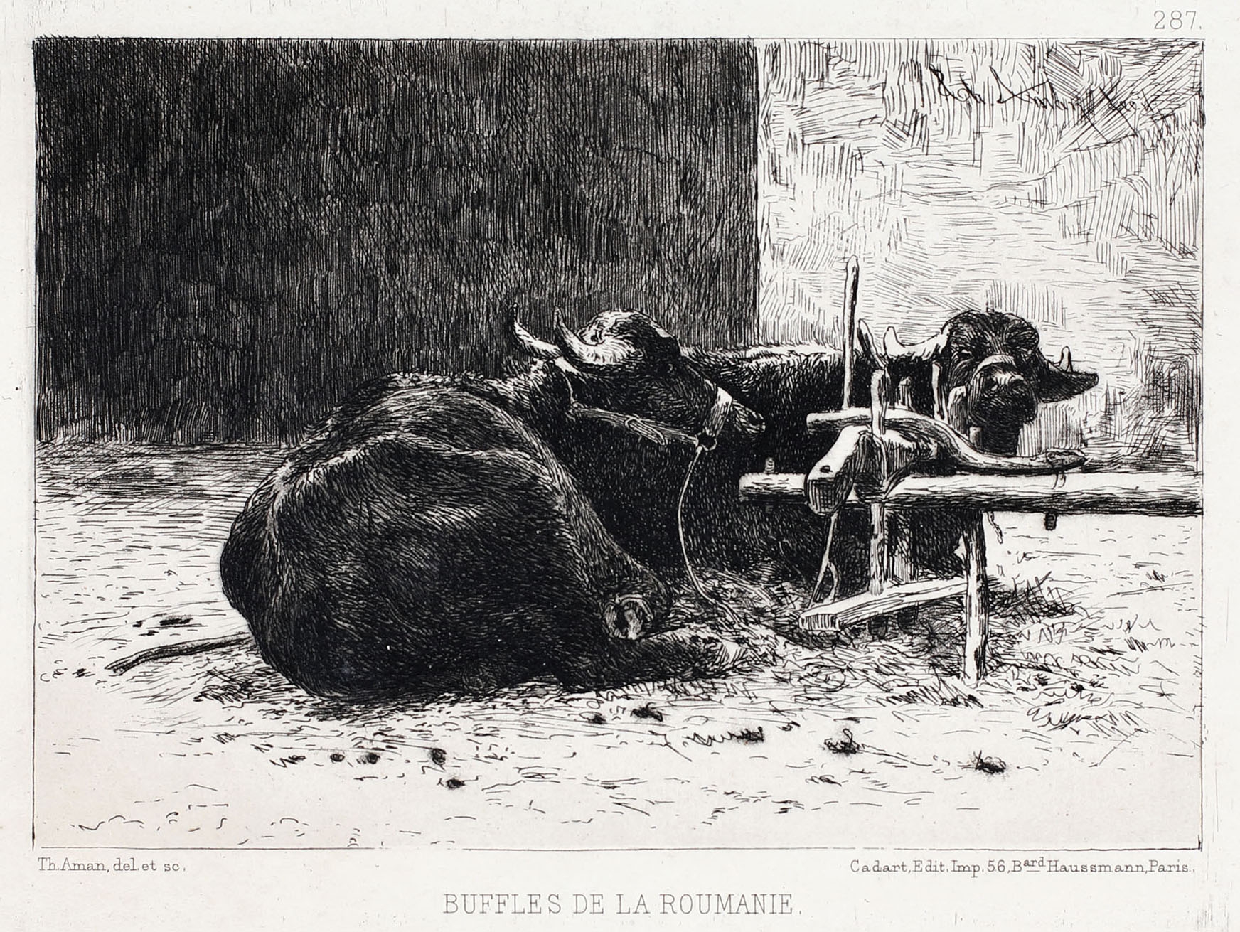 semnat dreapta sus, în placă, ”Sculpt Aman fecit”; menționată editura dreapta jos, sub cadru, ”Cadart. Edit. Imp. 56, Bard, Haussman, Paris”; notat stânga jos, sub cadru, ”Th. Aman del. et. sc.”; intitulat central jos, ”Buffles de la Roumanie”