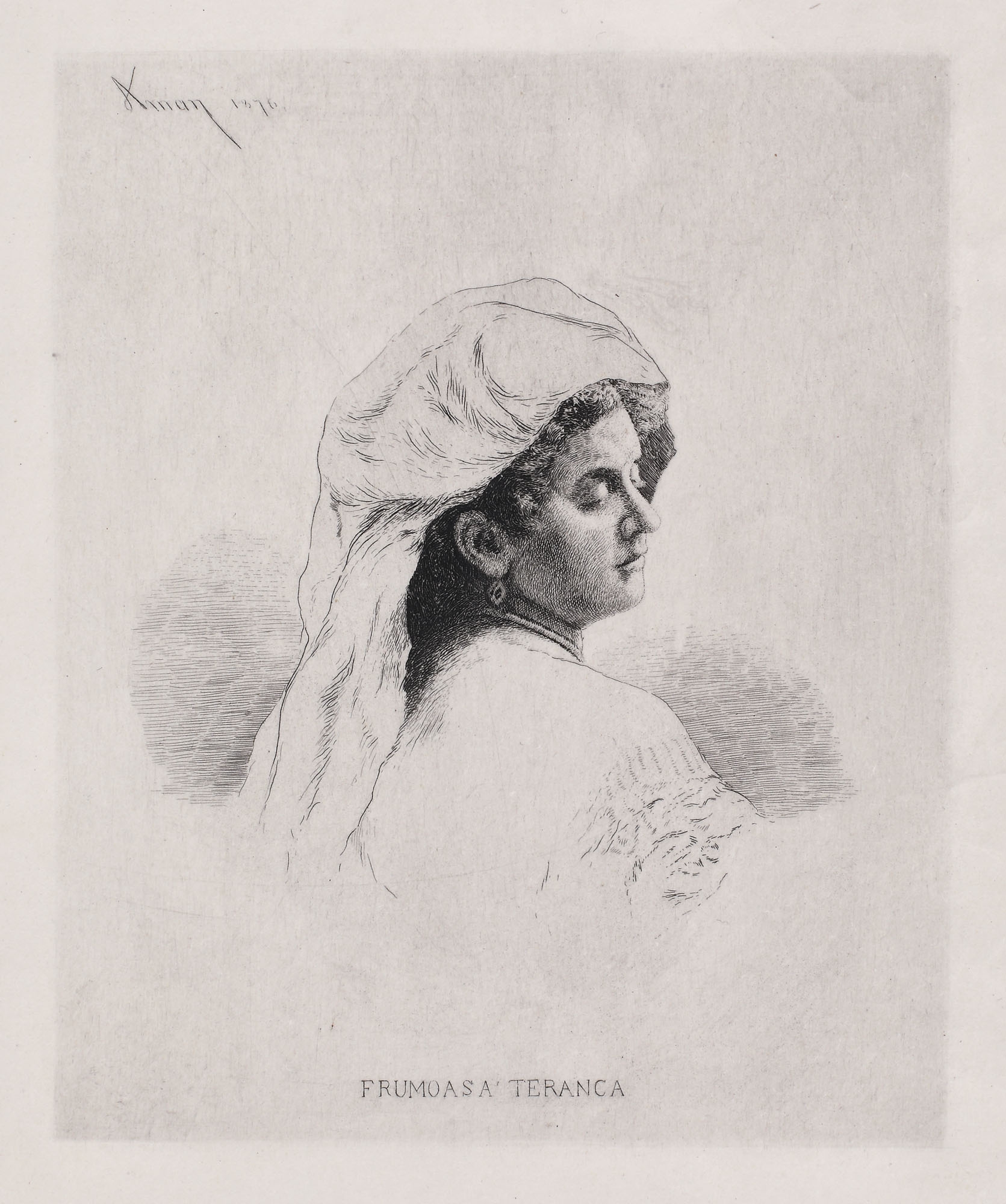 semnat și datat stânga sus, gravat, "Aman, 1876"; intitulat, gravat, central jos, sub cadru, "FRUMOASA TERANCA"