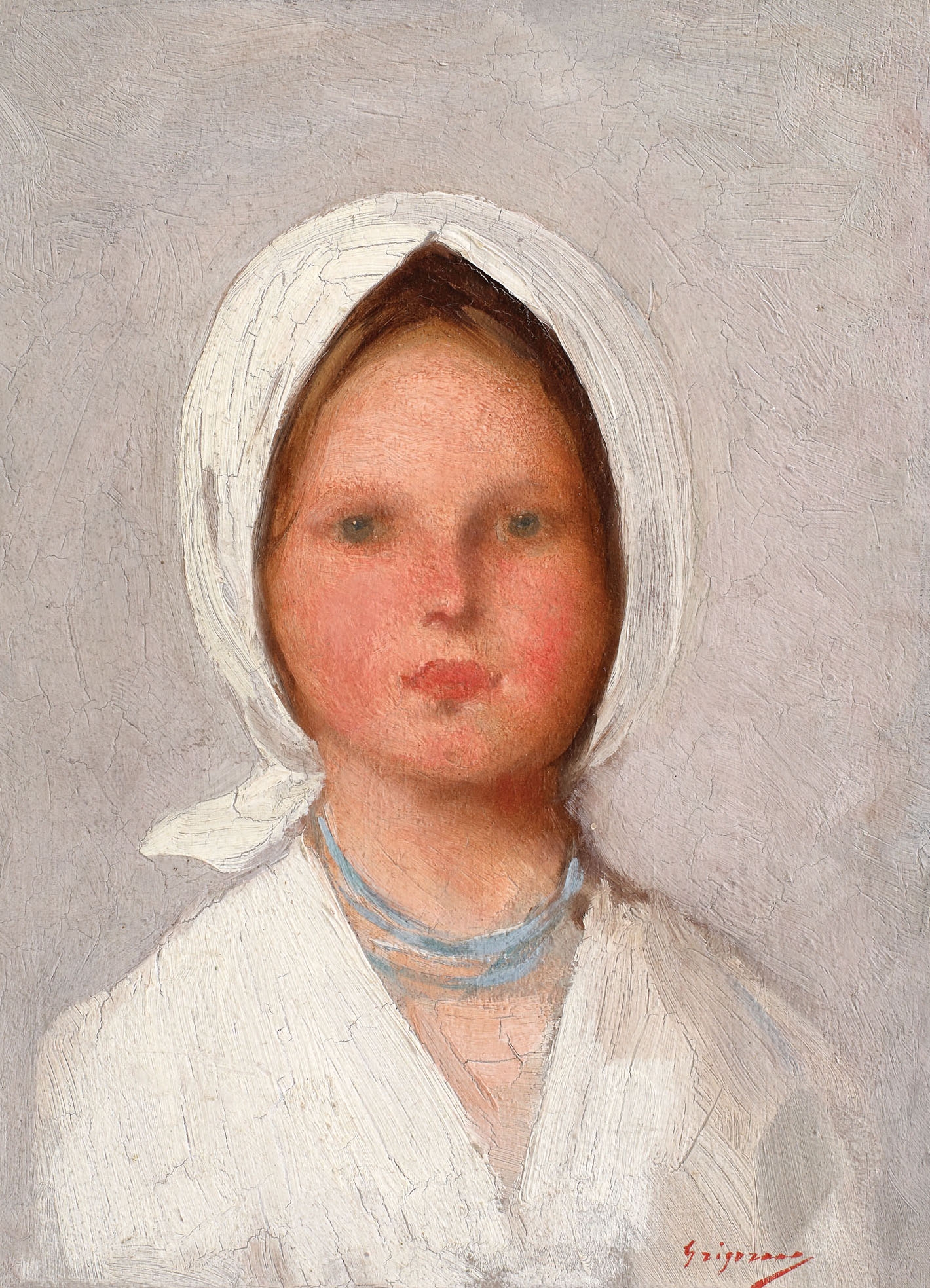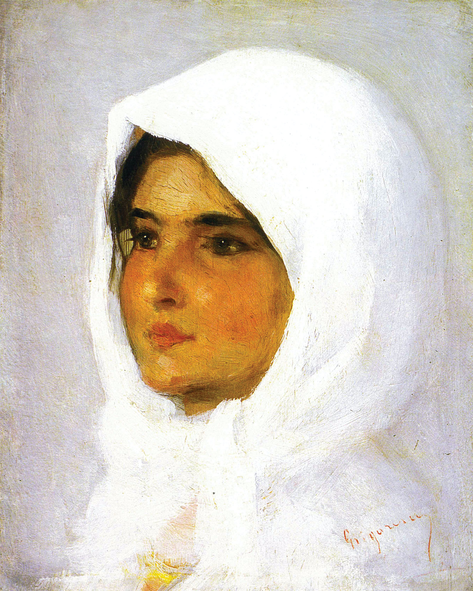 Cu un simț pictural impresionant de construcție al formei prin culoare și de echilibrare a raporturilor valorice, artistul Grigorescu a excelat în toate temele artei sale. Începând de la portret, la reprezentările carelor cu boi, la zugrăvirea ciobănașilor sau a țărăncuțelor în așteptare, până la peisajele în plină natură, Grigorescu a îndeplinit calitățile un autentic maestru al materiei. Posterior Războiului de Independență, Grigorescu va realiza o serie de opere semnificative pentru creația sa, precum „Evreul cu gâsca”, mai multe vederi și scene de la Vitré sau de pe malul mării sau „Colțul de atelier” din Bretania. Acestor lucrări se vor alătura și o serie semnificativă de portrete, rareori depășind proporții mari, ce aștern pe carton sau pe lemn subțire chipuri din profil sau din față ale modelelor. Observăm în această serie de portrete, un număr semnificativ de chipuri de femei - femeia fiind una dintre cele mai dese reprezentări grigoresciene. Plasate în spațiul domestic, în camere grădini, în jurul casei ori la câmp, modelele sunt cel mai adesea tinere, uneori mature și mai puțin vârstnice. Un alt aspect important în reprezentarea feminină îl constituie identitatea, care rămâne cel mai adesea un mister, scopul artistului fiind acela de a picta caractere generice. În afară de operele intitulate „portrete”, rare la număr, înfățișând adesea personaje, se alătură și operele denumite „studii”, sau cele ce primesc nume generice, precum și cele intitulate în jurul atmosferei create de un personaj. Astfel, titlurile lucrărilor ne semnalează o serie de semnificații, femeia suplinind adesea un statut social („Țărăncuță”, „Logofeteasă”, „Fata cu zestrea”), o îndeletnicire („Cusând”, „Cu acul”, „Țărancă torcând”, „Țărancă citind”), o particularitate estetică („Bălăioara”, „O floare între flori”), un loc de obârșie („Munteanca”), o proveniență etnică („Țiganca de la Ghergani”) sau o categorie de vârstă („Bătrână la Barbizon”). În seria portretelor feminine se încadrează și numeroasele opere înfățișând fete de la marginea orașului ori tinere femei din înalta societate. Cel mai adesea însă, remarcăm țărăncuța româncă, cu figură blândă și ținută cuviincioasă, țesută și împodobită de ea însăși. La căratul apei, strângând fânul, torcând, brodând, odihnindu-se pentru câteva clipe ori pe gânduri, tânăra țărăncuță este surprinsă într-o liniște profundă, când toate stau pe loc doar pentru a-i destăinui chipul. O întâlnește la Rucăr, la Câmpina, Mușcel, Ghergani, pe văile Dâmboviței, ale Buzăului sau ale Moldovei, locuri prin care Grigorescu se peregrina adesea când revenea în țară. Opțiunea artistului pentru spațiul rural, practicat anterior și la Barbizon, exprimă interesul său de a aduce o importanță însemnată specificului național, precum și dorința de conservare a valorilor tradiționale, reușind astfel să scoată pictura românească din tiparele academice. Opera sa ne rămâne astăzi mărturie vie a spiritualității naționale, un adevăr esențializat în imaginea desăvârșită a naturii și a omului, cărora Grigorescu le va rămâne fidel pe tot parcursul creației sale, dar mai ales omului – pe care îl surprinde cu căldură și înțelegere, zugrăvindu-l în pânze memorabile. (G.M.)