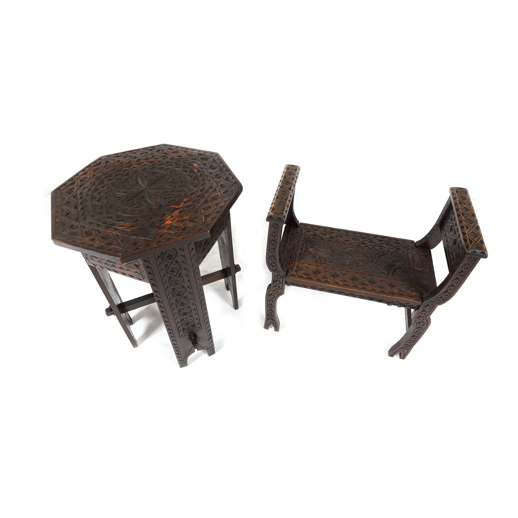 18. Lot format din măsuță de cafea și banchetă, decorate în stil Neo-Românesc, începutul sec. XX
