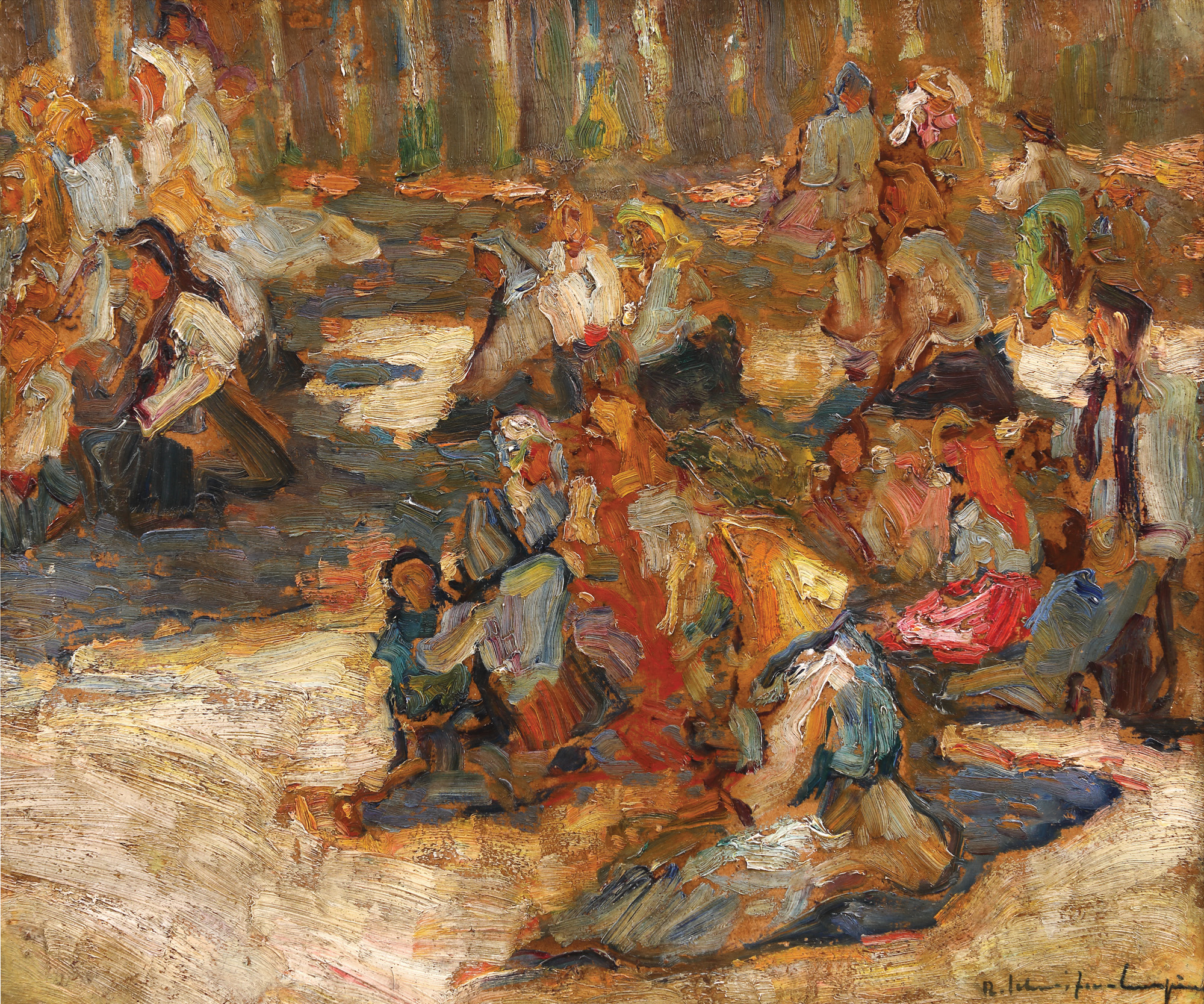 semnat, datat și notat pe verso, în creion, "R. Schweitzer Cumpăna, 1944, Serviciu divin la Biserica din Popești Leordeni în curtea bisericii părintelui canonic Gustav Muller"