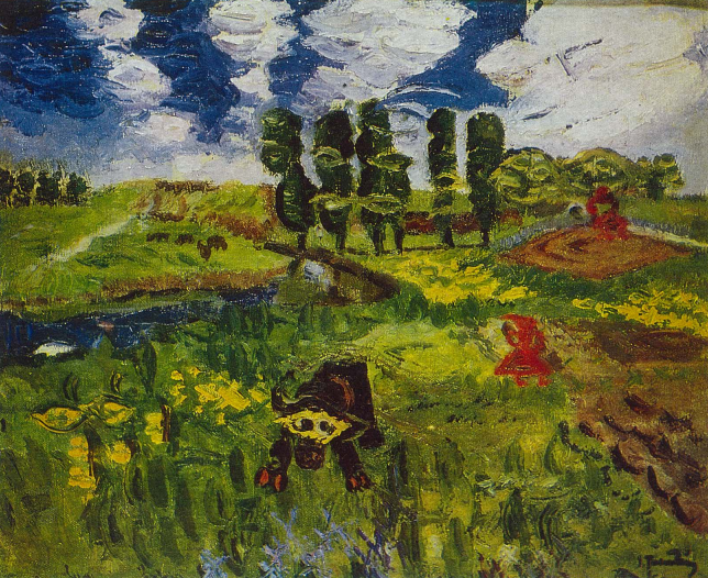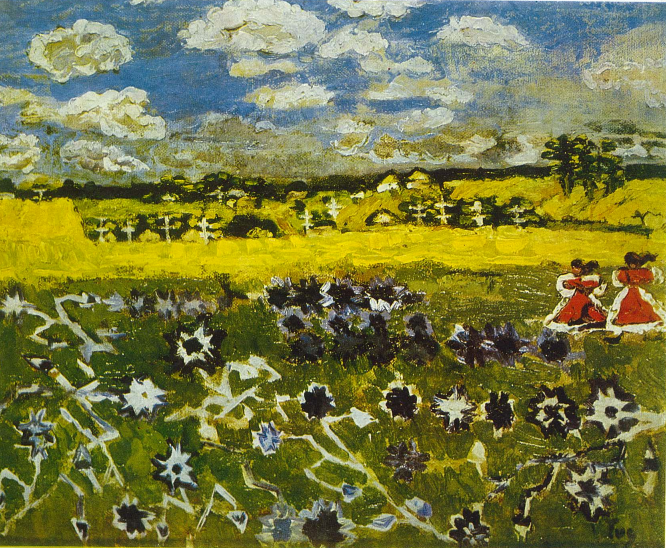 Temperament năvalnic, excesiv, circumscris modelului dionisiac și fantasmelor onirice, Ion Țuculescu se înfățișează în postura de pictor în anul 1938, în cadrul unei expoziții personale organizate în clădirea Ateneului Român. Înzestrat cu veleitățile autodidactului, efectuează studii libere, ”după natură și după maeștri”, așa cum el însuși afirmă. Își va utiliza dubla vocație, de biolog și creator, pentru a transcrie pe pânză veritabile pagini de natură cu ingeniozitatea savantului. Reface călătoriile predecesorilor săi în orientul mediteranean și în importantele capitale occidentale și recuperează, astfel, materialul vizual necesar experimentelor plastice viitoare. Se inspiră de la Petrașcu, Andreescu sau Luchian, dar se oprește și asupra unui Van Gogh sau a unui Gauguin. La baza creației sale va sta, însă, neclintit - foclorul românesc. Țuculescu se afirmă drept un autentic interpret al naturii și excelează mai cu seamă în realizarea peisajelor. În 1943 expune seria câmpurilor de rapiță, serie din care face parte și opera de față. Își relevă astfel viziunea expresionist-extatică a motivului natural exterior pe care îl va juxtapune nemijlocit naturii sale interioare dezlănțuite. Câmpurile sale cu rapiță sunt adevărate descărcări cromatice contrastante. Galbenul crud al vegetației e alăturat violetului închis al cerurilor care vestesc furtuna într-o revitalizare stilistică a artei populare desuete. Excepționala vocație a coloristului e accentuată de alternările armonioase de tonuri puternice și de pasta utilizată în mod voit exagerat. Momentul 1943 reprezintă o piatră de hotar – atât în evoluția plastică a artistului, cât și în receptarea sa de către critică și public. Artistul preia din maniera picturală a expresioniștilor și excelează în ilustrarea ritmurilor și în zugrăvirea tușelor. Spațiul său plastic, infinit și cu materializări neobișnuite, este brăzdat de o luminozitate artificială și de o cromatică brutală devenită laitmotiv. Depășește cadrul decorativ, pur imitativ și tinde către încărcarea afectivă a pânzei prin utilizarea unei palete exacerbate. Acordurile sale ornamentale sunt încastrate în accente de negru, nuanță pe care o asimilează din lucrările lui Petrașcu. Păstrează frânturi recognoscibile ale spațiului real din care se inspiră, însă le modifică în conformitate cu stimulii proprii. Țuculescu propune estetica fantastică a basmelor și inserează adesea troițe și păsări pe care le împrumută din arta populară. Propune o nouă ordine estetică și un set diferit de valori, pe care le transferă, treptat, operelor sale. Reinterpretează elementele folclorice într-o manieră profund modernizată și transferă viziunea analitică a biologului în tentative febrile de redare exhaustivă a frescelor dedicate naturii.