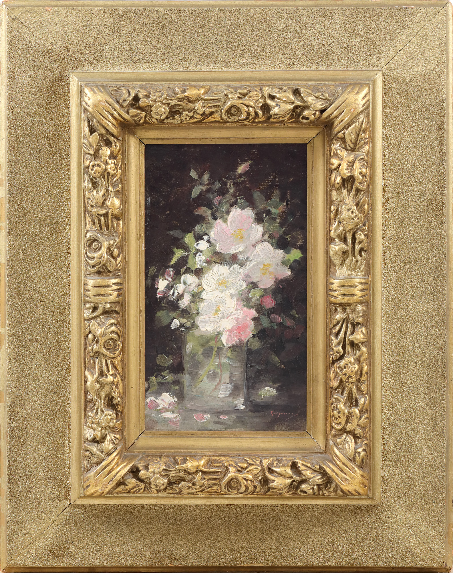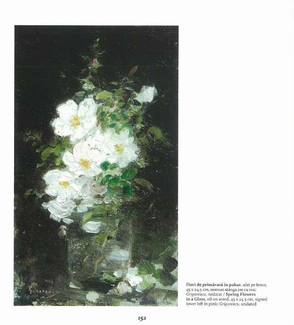 Bucuria de a picta miracolul naturii este mesajul pe care ni-l transmite artistul prin intermediul acestei opere de mici dimensiuni, format pe care îl afecţionează, căci îi permite exerciţii de virtuozitate. Creanga înflorită, ce evocă anotimpul preferat al lui Grigorescu, a fost un motiv recurent al operei din cea de a doua parte a creaţiei, un motiv armonizat cu sensibilitatea artistului pentru stampa extrem orientală. Frăgezimea petalelor iradiind lumină, transparenţa paharului de sticlă dar şi a apei, regia de ecleraj rezultând din punerea în contrast cu fundalul întunecat, constituie la un loc un subiect pictural rafinat și complex ce îl încântă în mod evident pe Grigorescu. Compoziţia este pusă în pagină prin accentuarea verticalităţii dreptunghiului-suport. Marcă a perioadei din jurul anului 1900, tuşa strălucitoare şi vibrantă ce reconstituie sintetic, magistral, datele naturii, este pusă spontan, cu siguranţă imbatabilă. Alături de urmele pensulei, instrumentul dominant, artistul marchează picturalitatea prin câteva accente aşternute în cuţit de paletă. Infinite nuanţe de alb şi de roz sugerează suavitatea şi prospeţimea florală, în timp ce, cu o măiestrie ale cărei mijloace rămân aproape secrete, artistul obţine sugestia de materialitate transparentă a paharului. Mai multe asemenea picturi realizate de Grigorescu pe suporturi de placaj similare permit înscrierea celei de faţă într-o remarcabilă serie de variaţii pe aceeaşi temă, dintre care amintim: “Buchet de flori luminoase” (Musée des Beaux-Arts d’Agen, Franţa, inv. 305 BR; 35 x 21 ), “Flori de cireş” de la Muzeul de Artă Braşov (inv.144; 45 x 24, 5), “Flori de cireş” (colecția Reginei Elisabeta, 1910; 34 x 21; reprodus în Vlahuţă, 1910, p. 218). (I. B.)