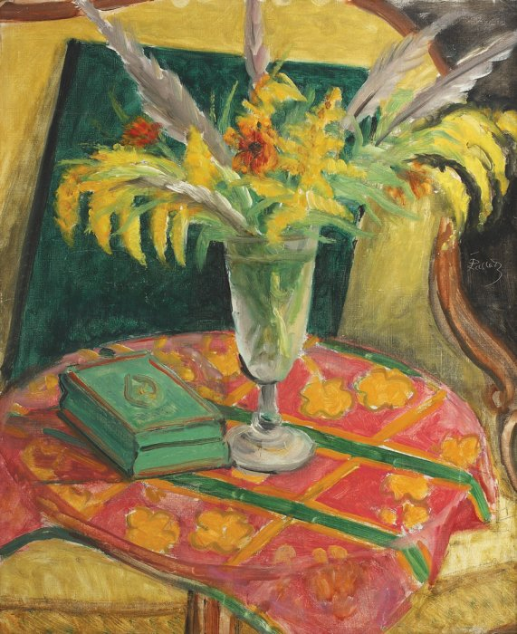 Maestru desăvârșit al compoziției, Pallady excelează în ordonarea subiectelor care compun naturile sale statice. De obicei, cărțile care încununează mesele din compozițiile sale fac trimiteri către volume care formează nucleul literar al pictorului: Baudelaire, Proust sau Nietzsche. Putem traduce, prin urmare, ritmurile literare, poetice sau filosofice din creația sa în tălmăcirea înțelesurilor unor capodopere universale. De această dată, însă, nu mai primim indicații precise cu privire la titlurile volumului alăturat vasului cu floarea-soarelui. Descoperim așadar o natură statică tipică, cu vasul cu flori poziționat central, înconjurat de hârtii, caiete, ochelari sau călimară. Pornind de la detaliile incluse pe copertă, am putea intui prezența unui caiet de schițe în partea din stânga jos a lucrării, în timp ce recuzita artistului (formată de această dată doar din perechea de ochelari), e poziționată central jos. Pe lângă literatură, Pallady își va găsi inspirația și în muzică, astfel că operele sale vor fi profund influențate și de solemnitatea pe care artistul o preia din partiturile lui Beethoven. Putem afirma, așadar, faptul că Pallady a redat cu ingeniozitate frumusețea unor forme care apar, în general, lipsite de semnificații și a excelat în codificarea simbolurilor în majoritatea pânzelor sale.
