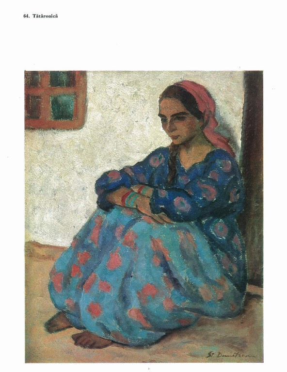 Pornind de la crezul conform căruia artistul poate învăța în orice împrejurare, Dimitrescu folosește călătoriile în țară și în străinătate drept repere vitale în căutarea sensului creației sale. În compozițiile cu personaje, și-a îndreptat atenția cu precădere asupra țăranului român, însă pânzele sale sunt bogate și în aparițiile tătarilor din zona Dobrogei. Atitudinea neîngrădită din lucrările artistului potențează prezența monumentală a protagoniștilor, surprinși în gesturi simple și îndelung calculate. Dimitrescu posedă o desăvârșită putere de analiză și sinteză totodată, astfel că va surprinde, prin liniile care descriu chipuri și siluete, umanitatea și factorul etnic al modelelor sale. Va pătrunde în subconștientul protagoniștilor săi și va fi atras, indiscutabil, de exotismul și pitorescul Dobrogei. În pânzele pictate aici vom regăsi îndeosebi oamenii adunați în jurul meselor, în atmosfera solară a teraselor și cafenelelor. Fin observator, artistul va fi capabil să redea, prin porturile și obiceiurile personajelor, atmosfera locală. Perioada 1927-1933 se va dovedi a fi prolifică în economia creației sale. Dimitrescu își petrece cu predilecție timpul în preajma litoralului și va împrumuta nuanțele puternice și impunătoare ale Balciului operelor sale. Perspectiva pe care o transcrie pictural e vizibil îngustată, artistul bucurându-se de plenitudinea panoramică pe viu și ocupându-și pânzele cu decupaje limitate la un subiect anume. Din Balcic provin unele dintre cele mai colorate compoziții ale sale – ”Cafeneaua lui Ismail”, în care predomină tușele însorite, ori ”Brutăria lui Mamut”, în care artistul mizează pe o plasticitate decorativă. În portrete, însă, se concentrează asupra individualizării personajelor care pozează pentru el. Cu o prezență impunătoare, muza de față se remarcă prin atitudine și vestimentație. Postura semi-rigidă a corpului, cu brațul drept care-i acoperă pieptul și se sprijină pe umărul opus, cu bărbia ușor ridicată și privirea îndreptată către un punct focal extern, ne indică atitudinea sigură și detașată a protagonistei. Atât carnația de sorginte orientală, cât și detaliile vestimentare, prin bogăția imprimeurilor și a culorilor, ori prin prețiozitatea podoabelor care îi decorează trupul, ne transpun în universul răsăritean în care pătrunde artistul. Șevaletul se va propti acum pe pământul arid, în timp ce pensulele sale vor împrumuta din atmosfera solară a locului.