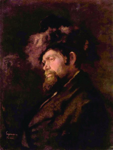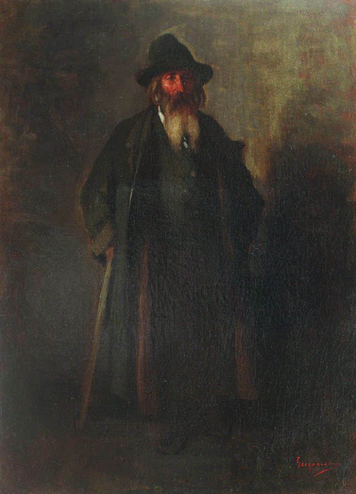 Surprinderea omului a reprezentat pentru Nicolae Grigorescu un exercițiu plastic însemnat, fiind adesea pus pe primul plan în detrimentul peisajului. Concepția umanistă probabil însușită încă din perioada de ucenicie și cea marcată de pictura bisericească avea să evolueze în timp către un proces analitic de observație a tipului uman. Pe lângă autoportrete, portretele amicilor, studiile de țărani sau țărăncuțe, Grigorescu se va dedica în diverse momente ale carierei studiului tipului autentic al evreului. Atras de pitorescul universului evreiesc, dar și de specificitatea traiului și a înfățișării, Grigorescu va executa primele studii și schițe în timpul călătoriilor prin Galiția (Ucraina de astăzi). Atunci când se întorcea din Paris în România, în anii 1864, 1867 și 1869, Grigorescu va alege trasee prin nordul României, poposind în Lvov (Lemberg atunci) de câteva ori. Primele tipuri de evrei le surprinde pe străduțele orașului galițian, pentru ca, ulterior, structura imaginară să fie completată cu imaginea comunităților evreiești din Moldova. Cea mai importantă campanie documentară avea să se înregistreze în a doua parte a anului 1874, atunci când, Grigorescu avea să își petreacă mare parte din vara și toamna anului în micuțul oraș moldovenesc. Astăzi, principala capodoperă pe care o datorăm itinerariului de la Bacău este „Bâlciul de la Bacău”, compoziție generoasă, realizată de Grigorescu în urma a luni și luni de observații și schițe (vezi caietul cu schițe de la Bacău din col. Cabinetului de Stampe al Bibliotecii Academiei Române). Însă ciclul cel mai important care ieșea din penelul lui Grigorescu era dedicat acestor personaje atât de interesante - evreii negustori. Atracția pentru acest tip uman era punctată de Vlahuță în monografia din 1910: „studii de evrei: telali, cârciumari, zarafi, belferi — fiecare, în mișcarea și cu expresia lui particulară înfățișându-ți portretul general al rasei, care te privește, din umbra vremilor biblice, prin ochii aceia întredeschiși, atenți, sclipitori, ochi ce nu dorm — îndărătul cărora simți sufletul îngrijat, încordat, al neamului îmbătrânit, pururea în luptă cu tinerețea celorlalte neamuri”. Grigorescu avea să studieze acest farmec al societății autentice moldovenești începând cu iulie 1874, moment în care sigur se afla la Bacău (scrisoare către doctorul Grecescu din 26 iulie), pentru a lucra, cu intermitențe, până în iarna aceluiași an în micul târg. Schițele în creion cu evrei aveau să fie completate de câteva opere în ulei, așa cum este și panelul de față, compoziția de vârf a ciclului fiind „Evreu cu caftan”. (I.P.)