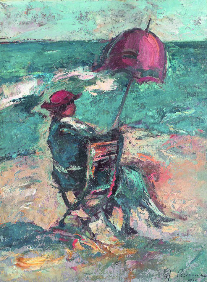 “Acea nostalgie marină pe care numai noi, cei născuţi şi crescuţi la mare credeam că o simţim, ne-a redat-o magistral Petraşcu, cel născut pe şes. La mare sau prin ţinuturile încărcate cu vapori, unde lumina vine tamisată şi contrastele dispar, paleta lui Petraşcu se înmoaie ca prin minune. În această atmosferă învăluită, vânjosul pictor se potoleşte, negrul lui se diluează pe paletă, roşul se calmează, iar albastrul şi cobaltul se îmbină într-o baie de verde émeraude, dând picturii acea fericită armonie şi nobleţe apuseană.” Cuvintele lui K.H. Zambaccian, marele colecționar de artă și totodată pasionat de creația lui Gheorghe Petrașcu, sunt cele ce denotă întocmai farmecul punctat de pensula și cuțitul artistului. Cu atât mai mult sunt adevărate cuvintele lui Zambaccian atunci când spiritul marin se regăsește și în tema aleasă de pictor; astfel, descoperim acel albastru de cobalt în opere ca cea de față, desfășurate în mediul preferat de artist, marea. Eclectismul tematic ne amintește de opera lui Grigorescu, în seria de pânze realizate în Bretania, în care surprinde câte un personaj feminin pe malul mării, într-una dintre cele mai expresive creații impresioniste românești. Petrașcu, urmaș spiritual al lui Grigorescu și influențat direct de acesta pentru o bună parte a debutului, pictează această serie într-un fel de omagiu adus creației grigoresciene. În plus, ciclul artistului nostru primește o notă aparte prin faptul că modelul folosit este aproape exclusiv soția sa, alături de care a călătorit în majoritatea itinerariilor realizate în perioada interbelică. Techirghiol avea să devină locul principalelor compoziții marine din cursul anului 1935, fapt confirmat de sumedenia de lucrări din expoziția personală din 1936 în care Techirghiol este amintit.
