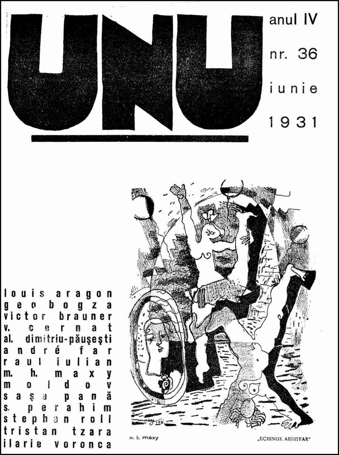 Într-o perioadă în care întreaga societate românească se reidentifica o dată cu întregirea statală, într-un proces cu adevărat european ce urma primul Război Mondial, avangarda autohtonă avea să se contureze în urma unui colaborări exuberante în toate planurile culturale. Urmând pașii conanționalului Tzara, care “șoca” încă din perioada războiului, alături de mișcarea dadaistă de la Cabaret Voltaire, pictorii și scriitorii, ce se vor defini mai târziu drept avangardiști, vor colabora spre realizarea unui adevărat proiect național și european, mai mult decât relevant epocii respective. Marcel Iancu, M.H. Maxy, Victor Brauner, Jules Perahim, Milița Petrașcu, Jacques Herold, de partea artei plastice, Ion Vinea, Sașa Pana, B. Fundoianu, Stephan Roll, Ilarie Voronca, Ion Călugăru sau Geo Bogza, de partea scriitorilor, sunt doar o parte din pleiada adevăratelor personalități ale avangardei și culturii românești interbelice, ce vor anima și după al doilea Război Mondial mișcările estetice autohtone, dar și internaționale. Revista de avangardă “Unu”, alături de predecesoarele “Contimporanul”, ”75HP”, ”Punct”, sau ”Integral” a fost cea care a creat în jurul ei și a editurii cu același nume una dintre cele mai coerente mișcări literare, nu doar pentru nișa pe care o reprezenta, ci pentru întreaga cultură românească. Cei care au susținut și au colaborat cu Mișcarea de la Unu (așa cum o intitula Michael Ilk, în colaborare cu Vladimir Pană, în studiul asupra revistei) sunt în mare proporției cei pe care i-am enumerat mai sus, avându-l portdrapel pe Sașa Pană, creatorul revistei și a editurii. Revista a funcționat între aprilie 1928(o dată cu apariția primului număr, manifest) și decembrie 1932, cu numărul 50, „UNU Ultim”. În cei patru ani de activitate “Unu” s-a definit tocmai prin abordarea sub egida largă a suprarealismului, atât a temeiurilor dadaiste sau futuriste cu scopul de a se debarasa de orice constrângere academică. Creatorul “Unu”, Sașa Pană, medic de profesie, avea să publice la editura sa începând cu 1930, când realiza cel de-al doilea său volul, “Diagrame”, urmat, la doar un an distanță de volumul de prozopoeme “Echinox arbitrar”. Colaborarea cu artiștii plastici nu avea să se limiteze doar în paginile revistei, astfel, și în cazul “Diagrame” și “Echinox arbitrar”, Brauner, respectiv Maxy aveau să îi ilustreze publicațiile. Pentru volumul realizat în 1931, Maxy a realizat coperta și alte trei desene, cel de față fiind cel ce ilustrează pagina 25. Aceeași operă avea să ilustreze coperta nr. 36 al revistei “UNU”, însemnătatea micuțui tuș fiind aprofundată de Maxy un an mai târziu, când picta “Dans”, pornind chiar de la motivul central din opera noastră. (I.P.)