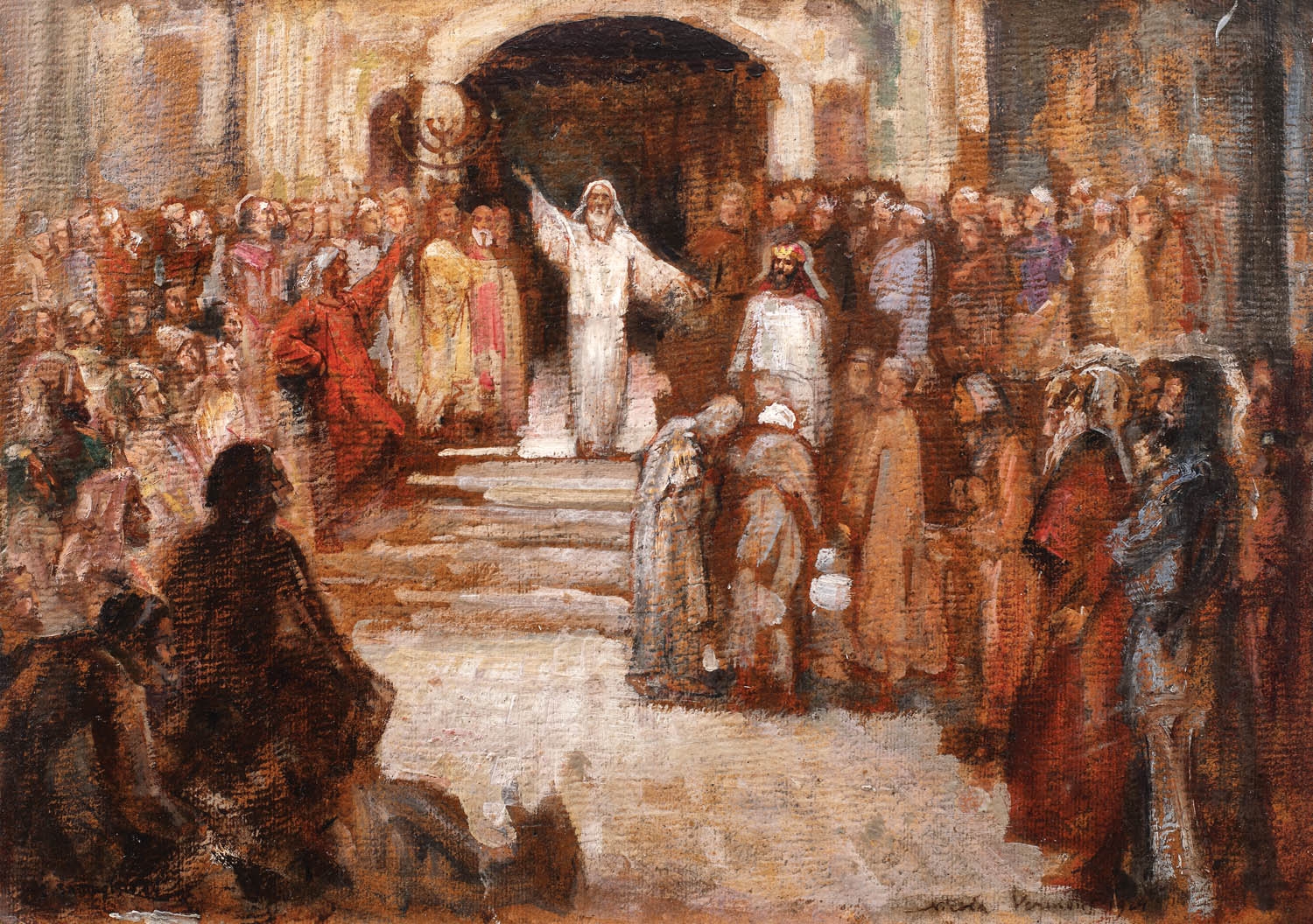 Predilecţia lui Nicolae Vermont pentru tematica religioasă poate fi pusă în primul rând pe seama puternicei influenţe în arta pictorului român a şcolii müncheneze de pictură, ce la sfârşitul secolului al XIX-lea a cunoscut o intensificare a operelor religioase. Artiştii münchenezi, printre care şi profesorii lui Vermont, au practicat genul compoziţiei religioase, acordând o deosebită atenţie fidelităţii în reprezentarea spaţiului natural, a costumelor şi a atmosferei caracteristice epocii. Aceste principii sunt respectate şi de Vermont, ale cărui opere religioase au un evident caracter documentar. Momentul în care Vermont începe să se aplice subiectului religios, cel puțin cu câte o compoziție anual, pare a fi 1904, când expunea în cadrul Tinerimii Artistice “Inchinarea păstorilor“. Isidor Grunberg, după convertirea la creștinism - Nicolae Vermont, avea să se aplece asupra multor teme biblice celebre. Astfel pictează “Botezul“, “Christ consolator“, “Lapidarea Sf. Ștefan“, “Femeia Adulteră“, “Învierea fiicei lui Lair“ sau “Coborârea de pe cruce“. Această serie pare a se încheia după Primului Război Mondial, întâlnind un nou ciclu în cursul anului 1924, an din care ne parvine și studiul de față.