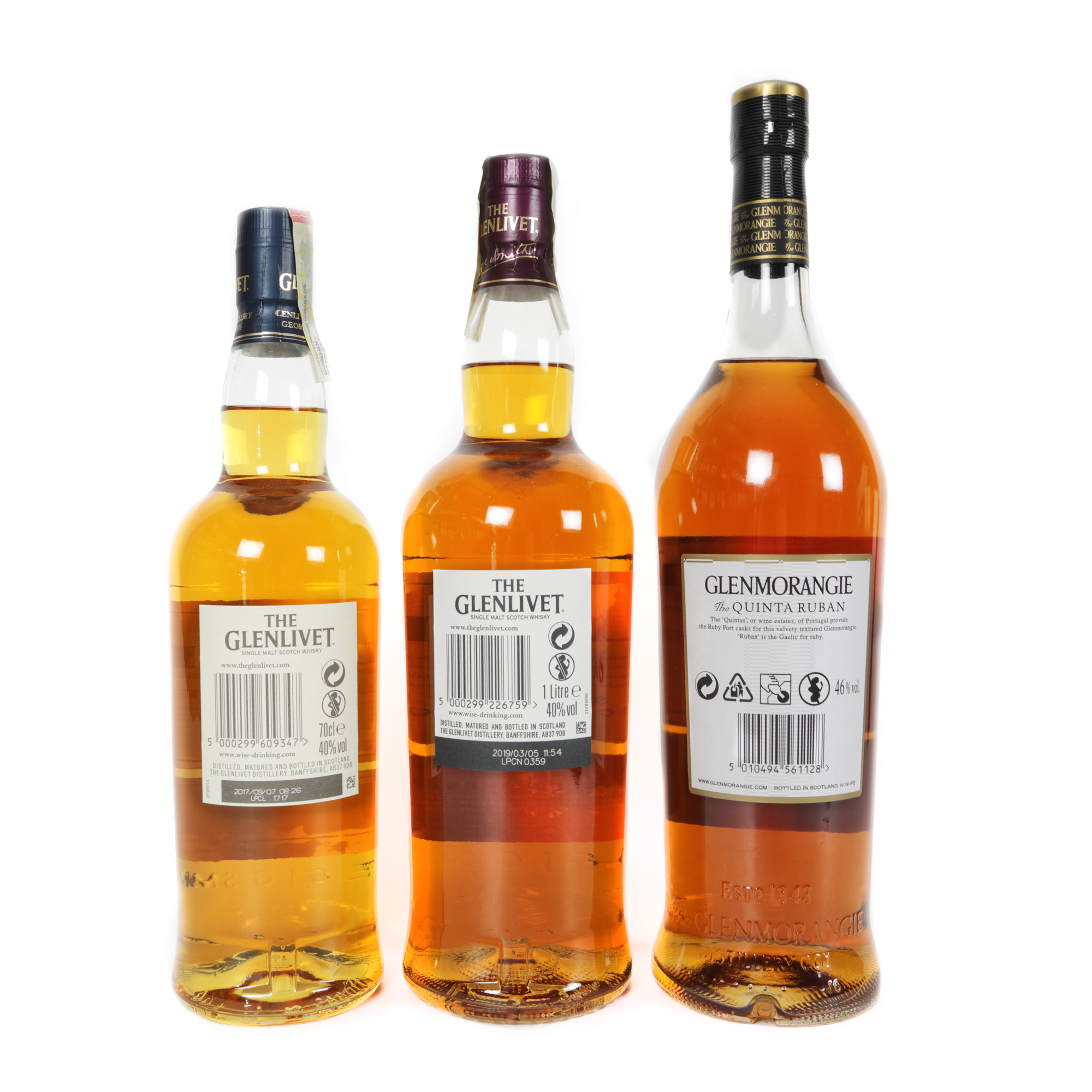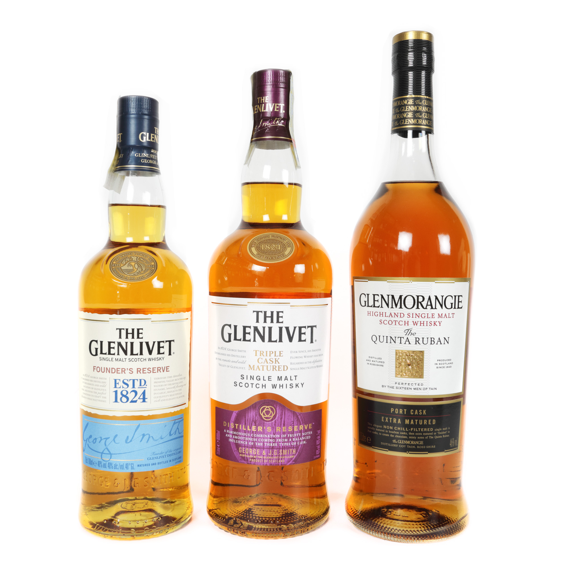 7. Glenlivet Single Malt, Glenmorangie Quinta Ruban, Glenlivet Distiller's Reserve, 2st x 1l, 1st x 0,70l
