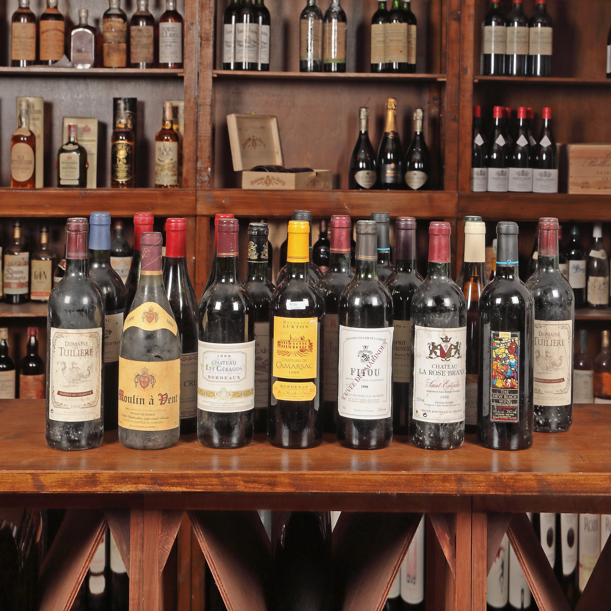 The New Black Wine, Cahors AOC, 1998, 3st x 0,75l Les Creisses, Philippe Chesnelong, 1998, 3st x 0,75l Bourgogne Aligote, Guy Pierre, 1999, 1st x 0,75l Evelyne Bodillard, Saint Véran AOC, 1998, 1st x 0,75l Domaine La Tuilière, Réserve du Chasseur, 1998, 2st x 0,75l Esprit de Vignes, Côtes de Saint-Mont, 1998, 1st x 0,75l Château La Condamine Bertrand, Côteaux du Languedoc, 1998, 1st x 0,75l Château les Gerauds, Bordeaux, 1999, 1st x 0,75l Château de Camarsac, Berenice Lurton, Bordeaux, 1999, 1st x 0,75l Louis de Belair, Costières de Nîmes, 1998, 1st x 0,75l Moulin-à-Vent, 1999, 1st x 0,75l Château Tour Canon, Lalande de Pomerol, 1998, 1st x 0,75l Domaine Cellier de la Pierre, Fitou AOC, 1998, 1st x 0,75l Château La Rose Brana, Saint-Estèphe AOC, 1998, 1st x 0,75l Având în vedere vârsta înaintată a sticlelor, nivelul de lichid în sticlă, etichetele și capișoanele pot avea semne de evaporare și/sau uzură.