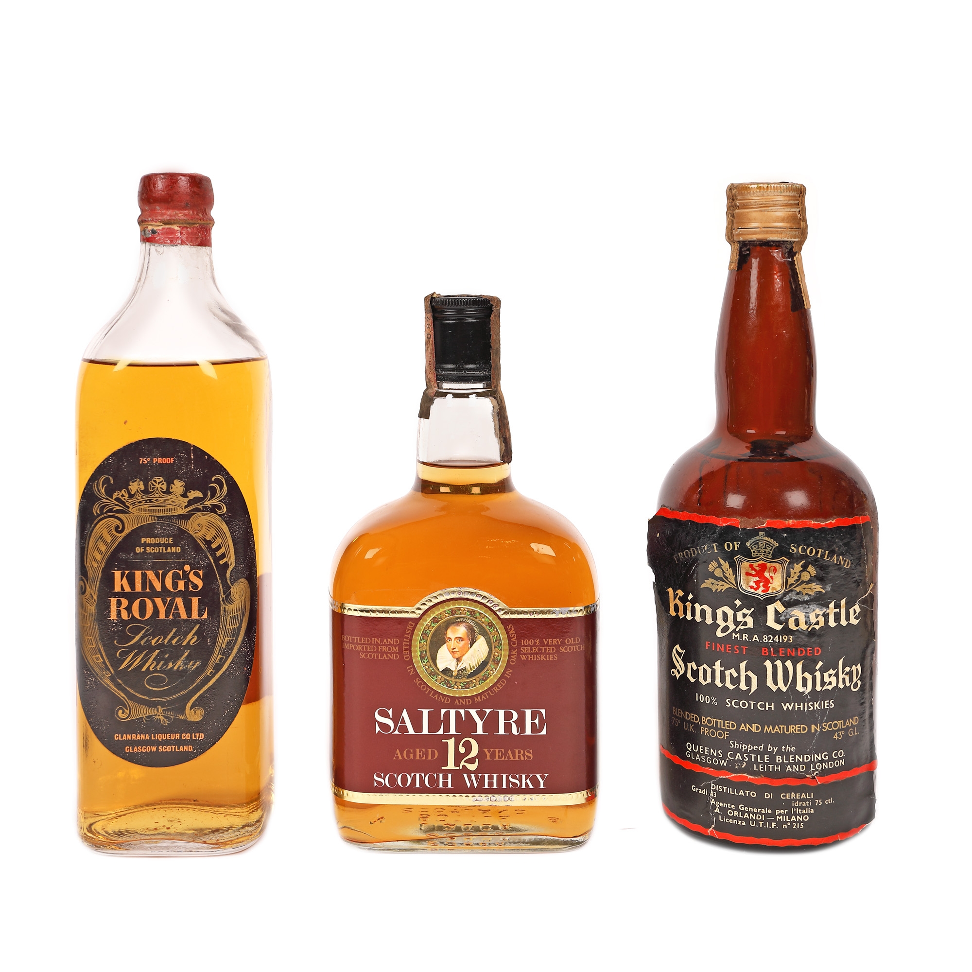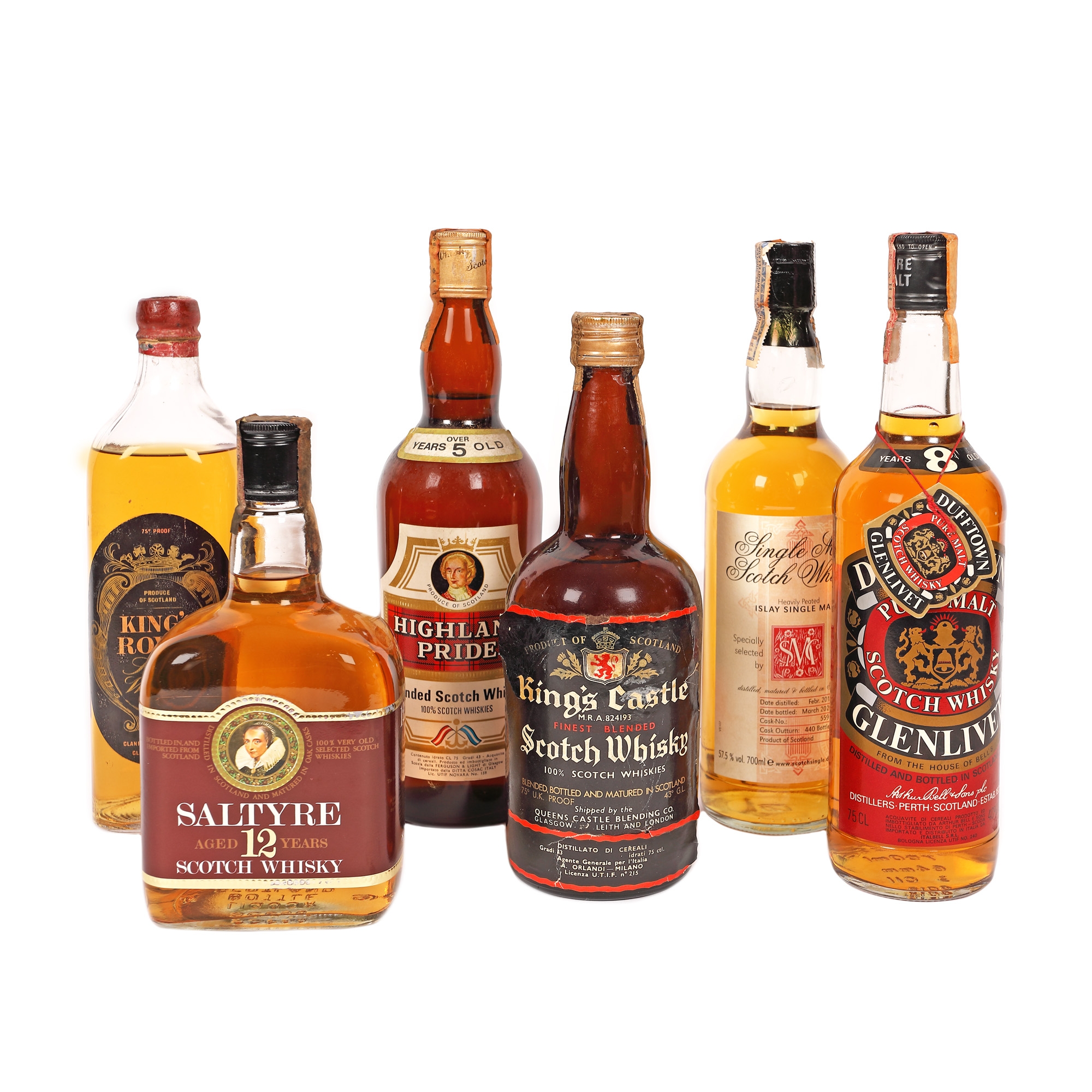 57. Lot format din șase sticle de whisky, Queen's Own Scotch Whisky, Old Bannockburn 5 ani vechime, King Henry VIII, Grant's, Westminster, Macphersons Cluny