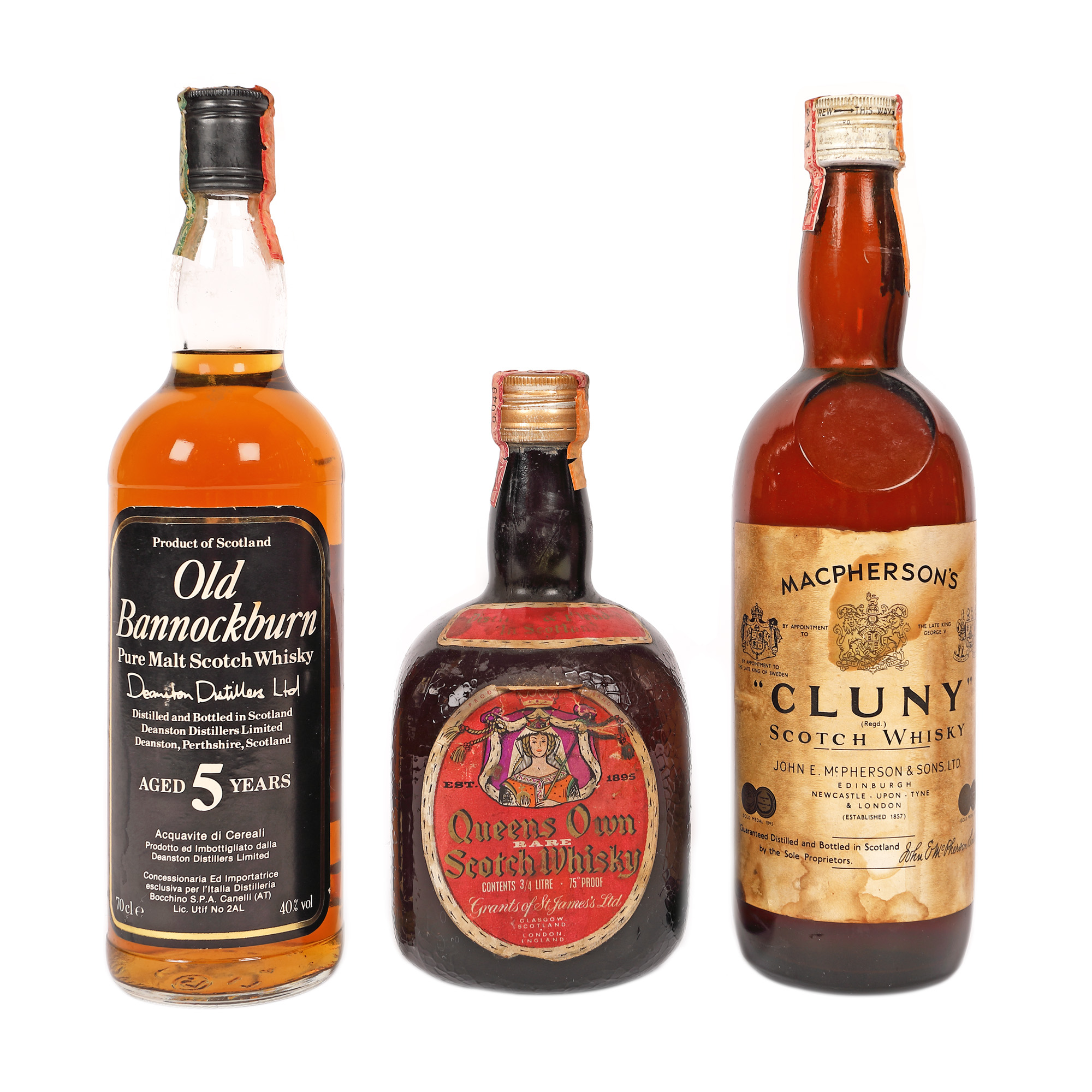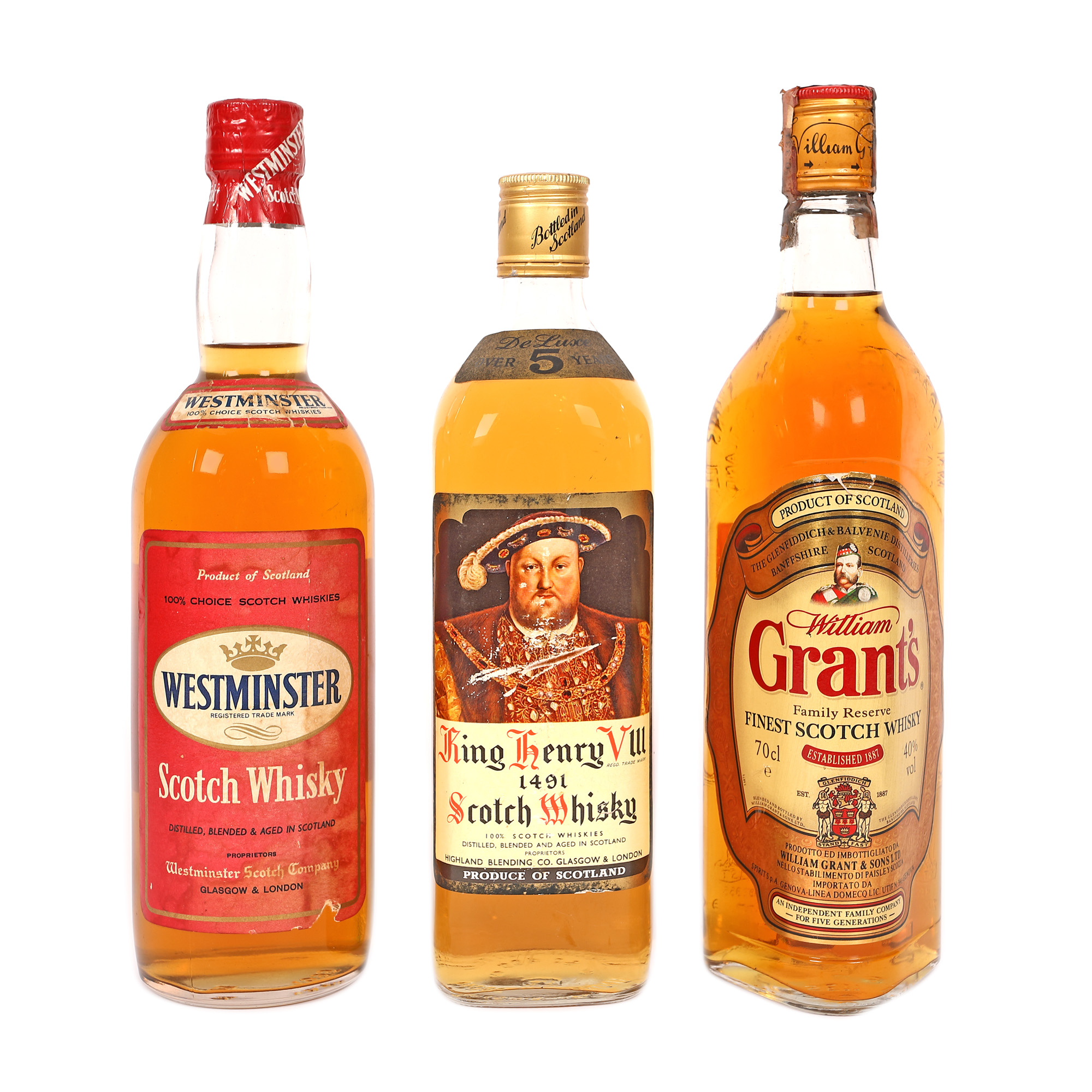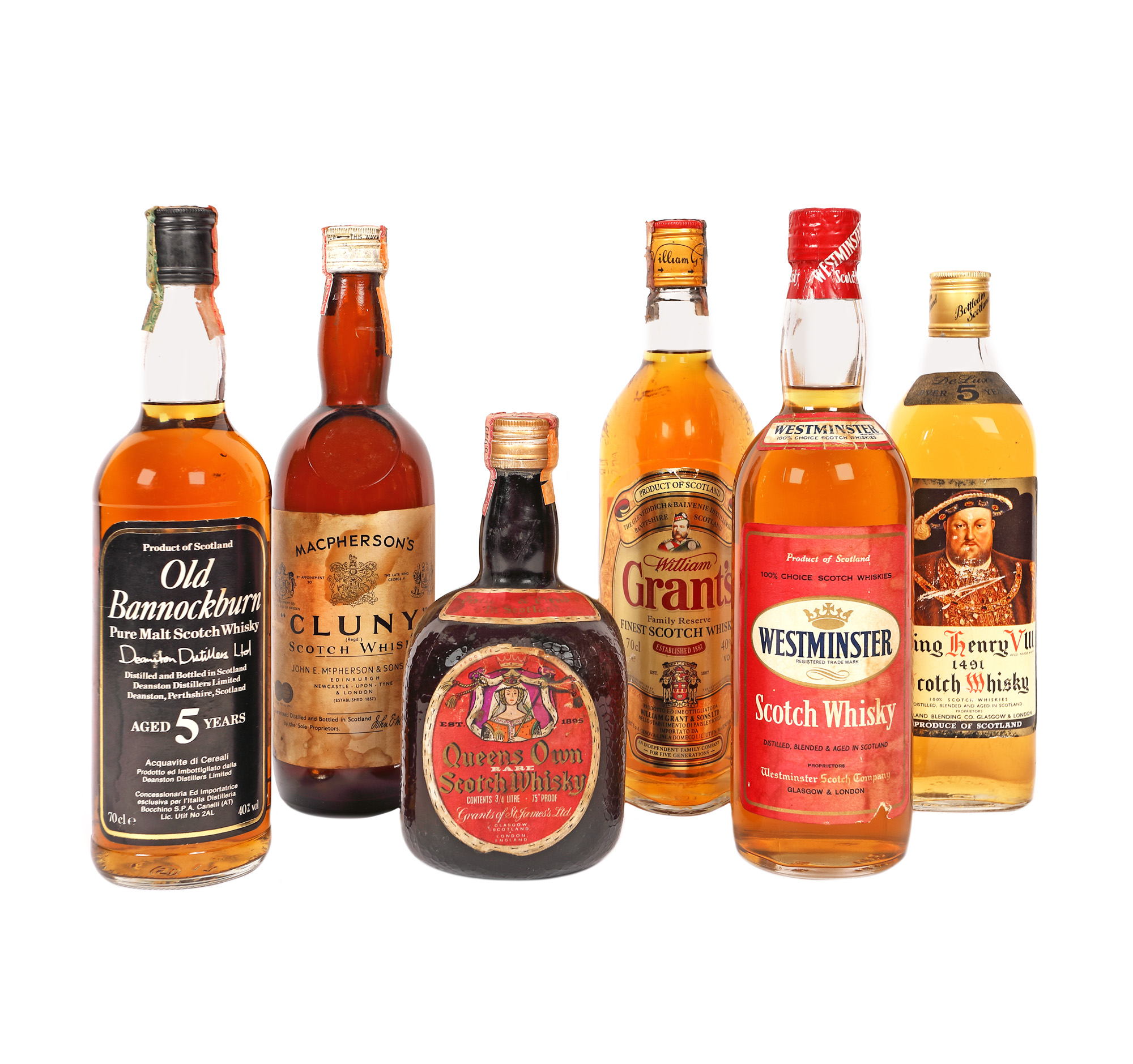 56. Lot format din șase sticle de whisky, Saltyre 12 ani vechime, Highland Pride 5 ani vechime, King's Royal, Dufftown-Glenlivet 8 ani vechime, King's Castle, Single Malt Scotch Whisky Islay
