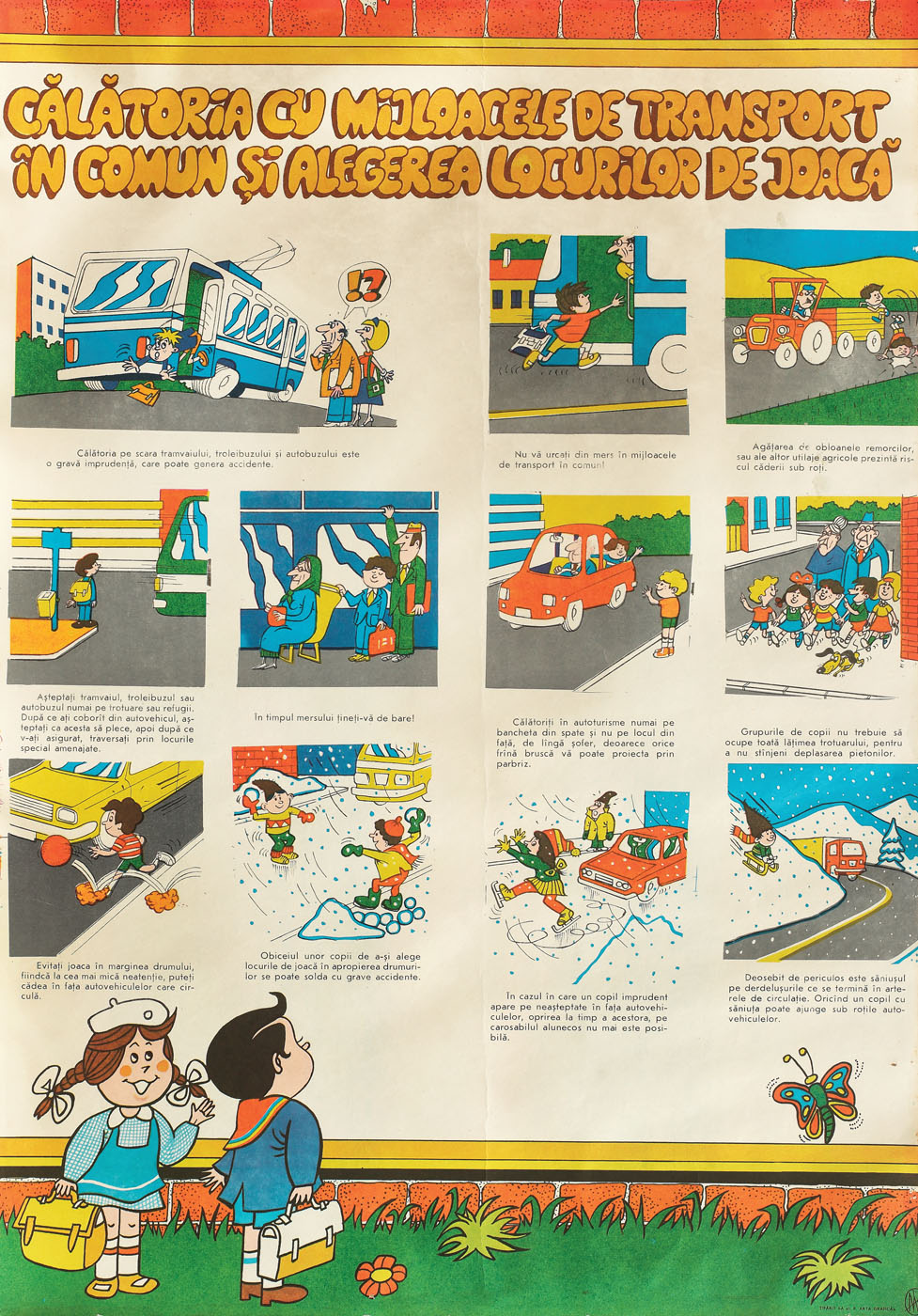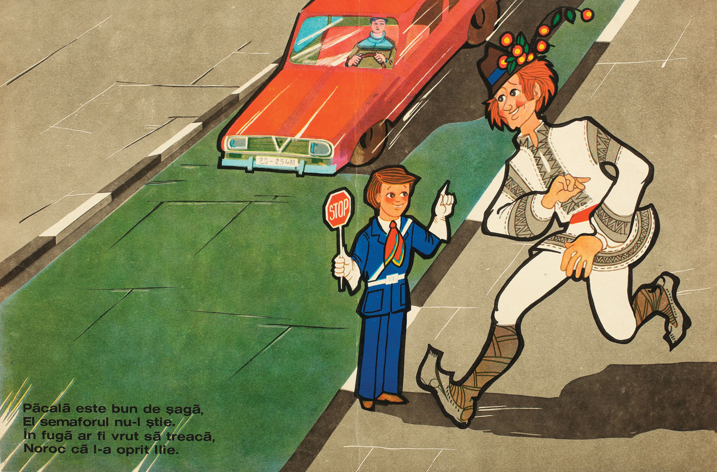 16. Afiş educativ, respectarea regulilor de circulaţie, cu Păcală, cca. 1970