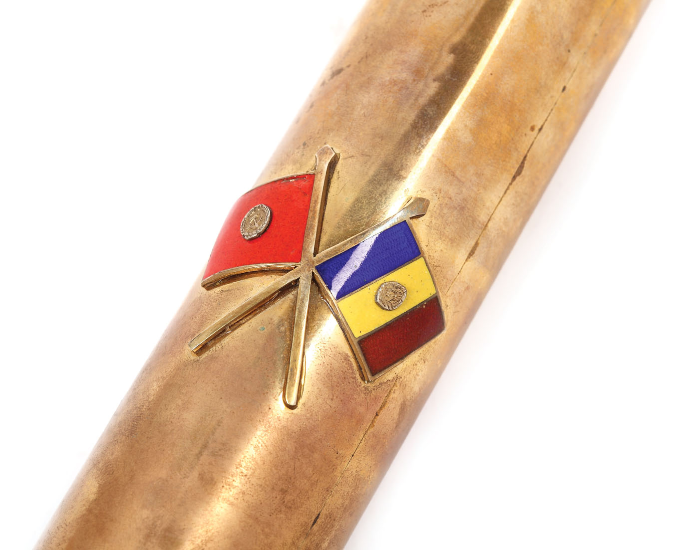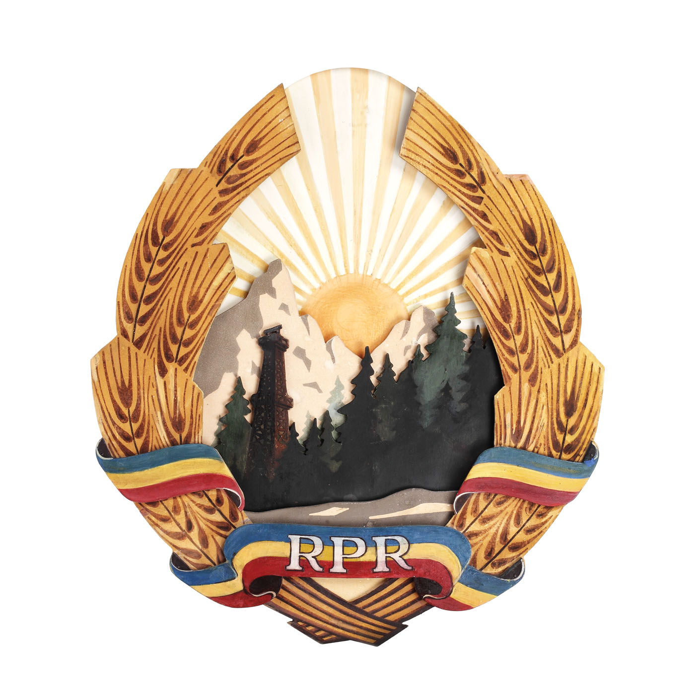 33. Stemă a Republicii Populare Române în relief, colaj din lemne pictate, 1964