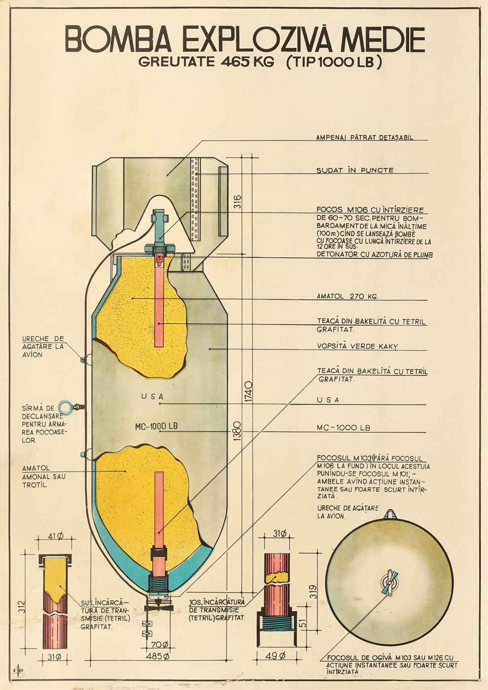3. Lot format din două afişe didactice, cu elementele componente ale bombei, Întreprinderea "13 decembrie 1918", cca. 1970