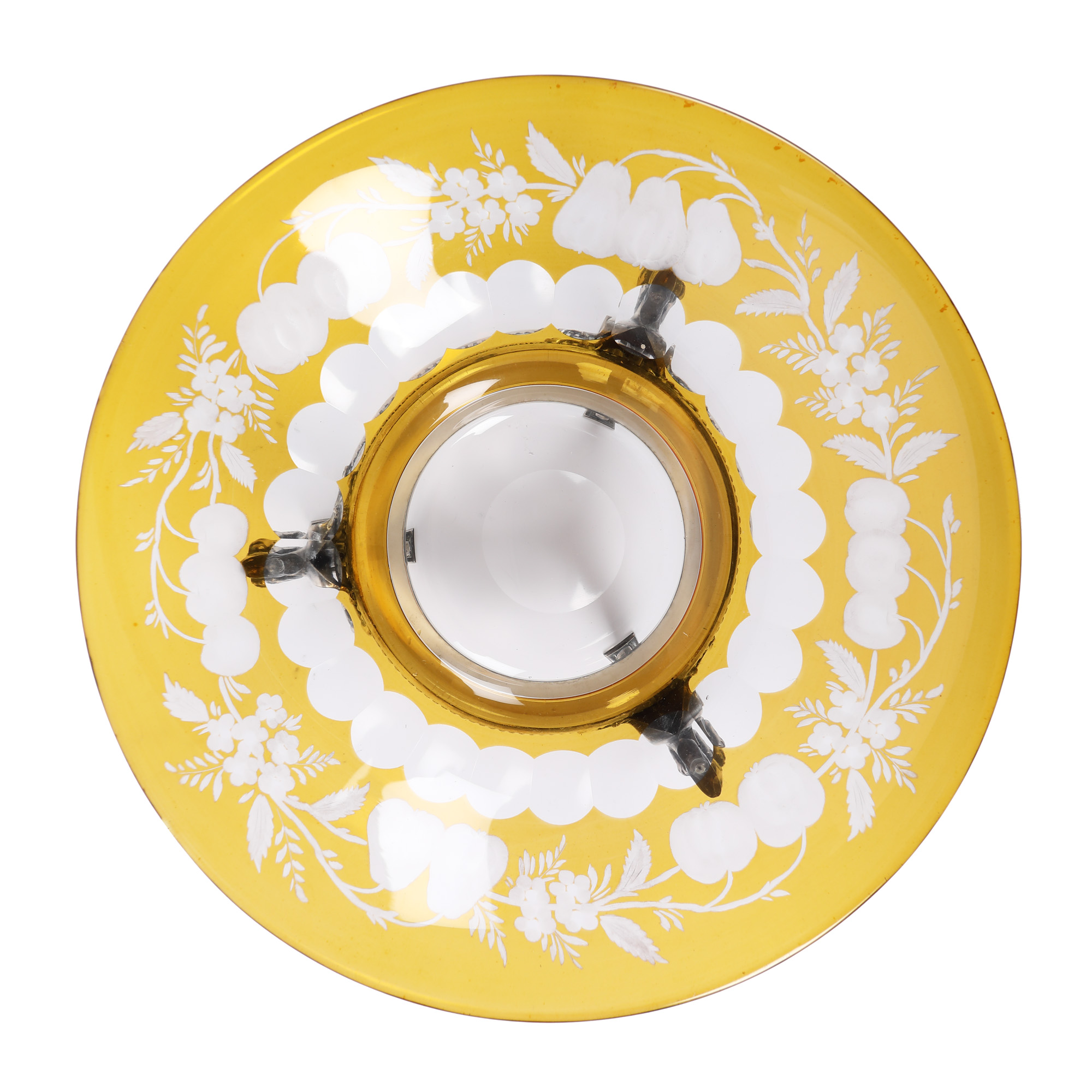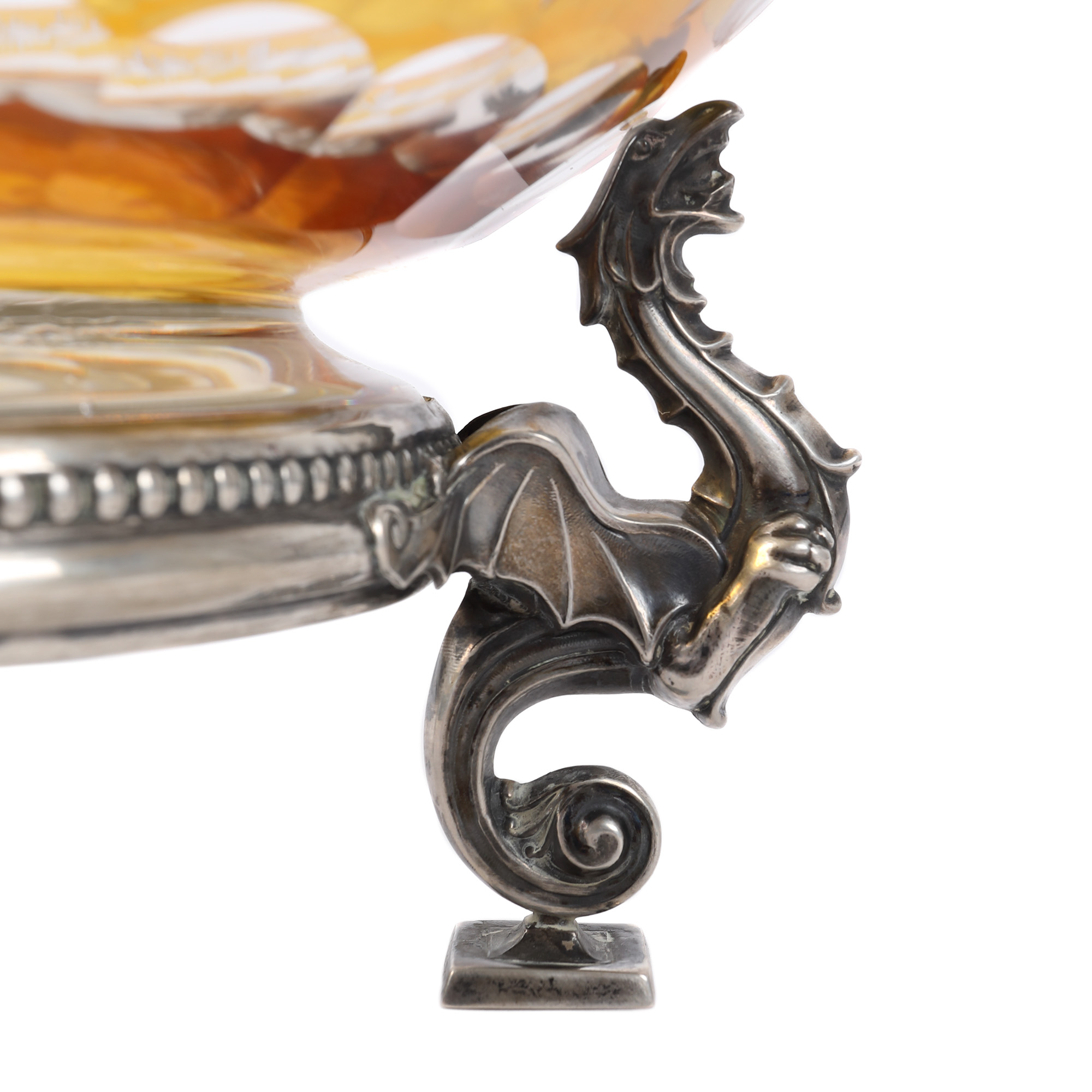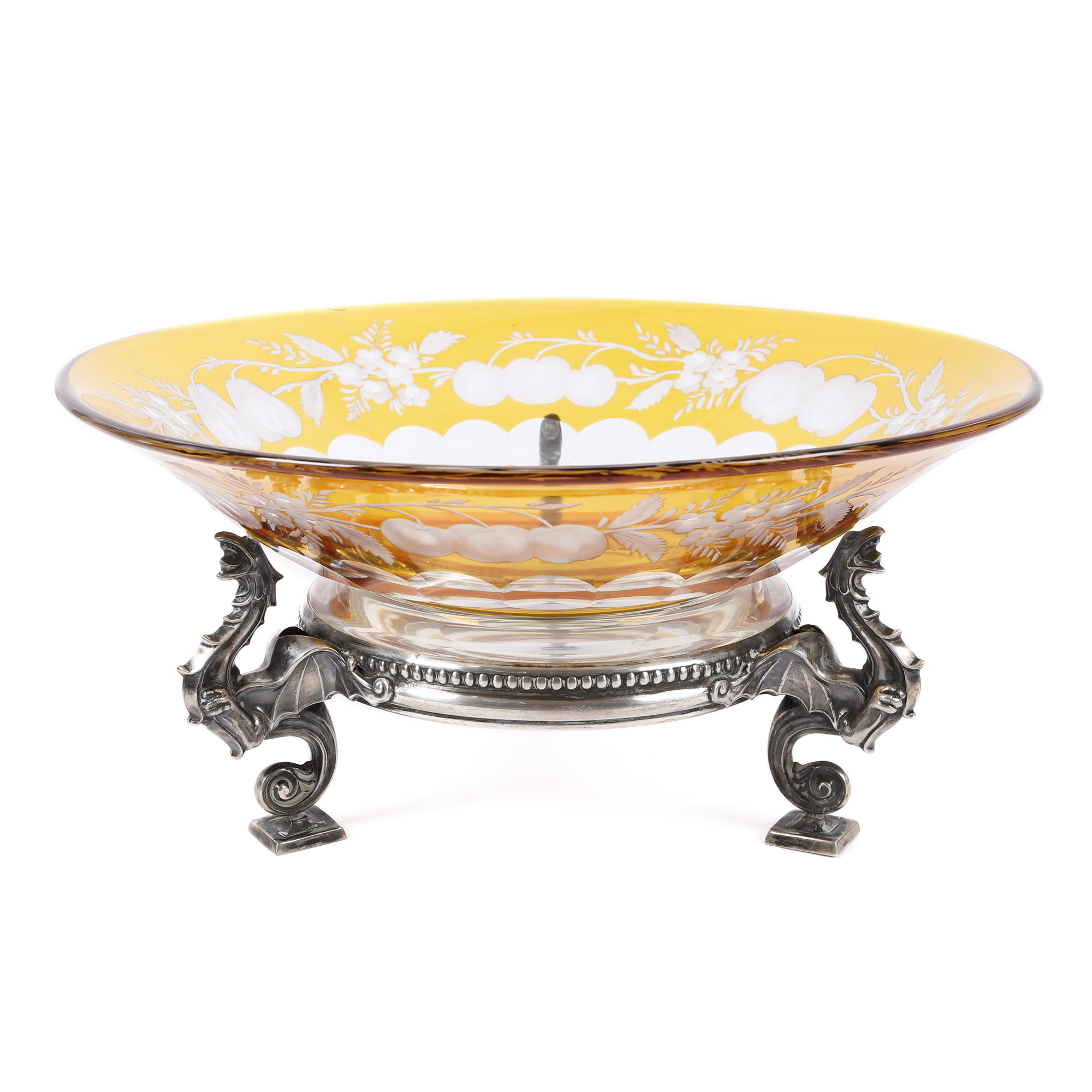 34. Fructieră din cristal, cu montură din argint, decorată cu animale fantastice, prima jumătate a sec. XX