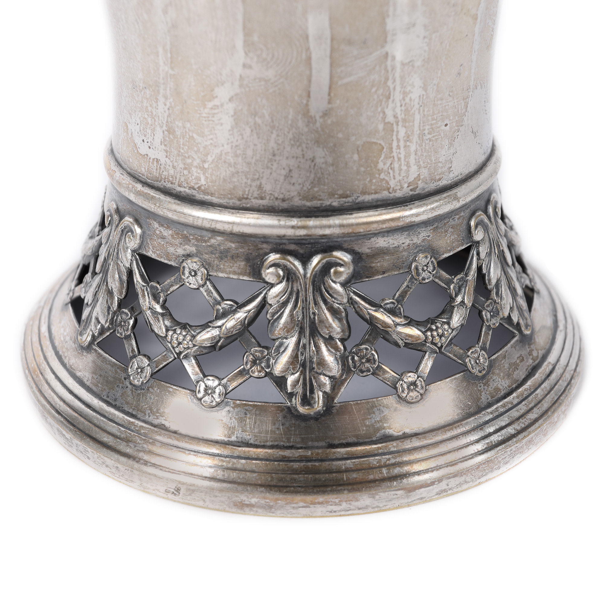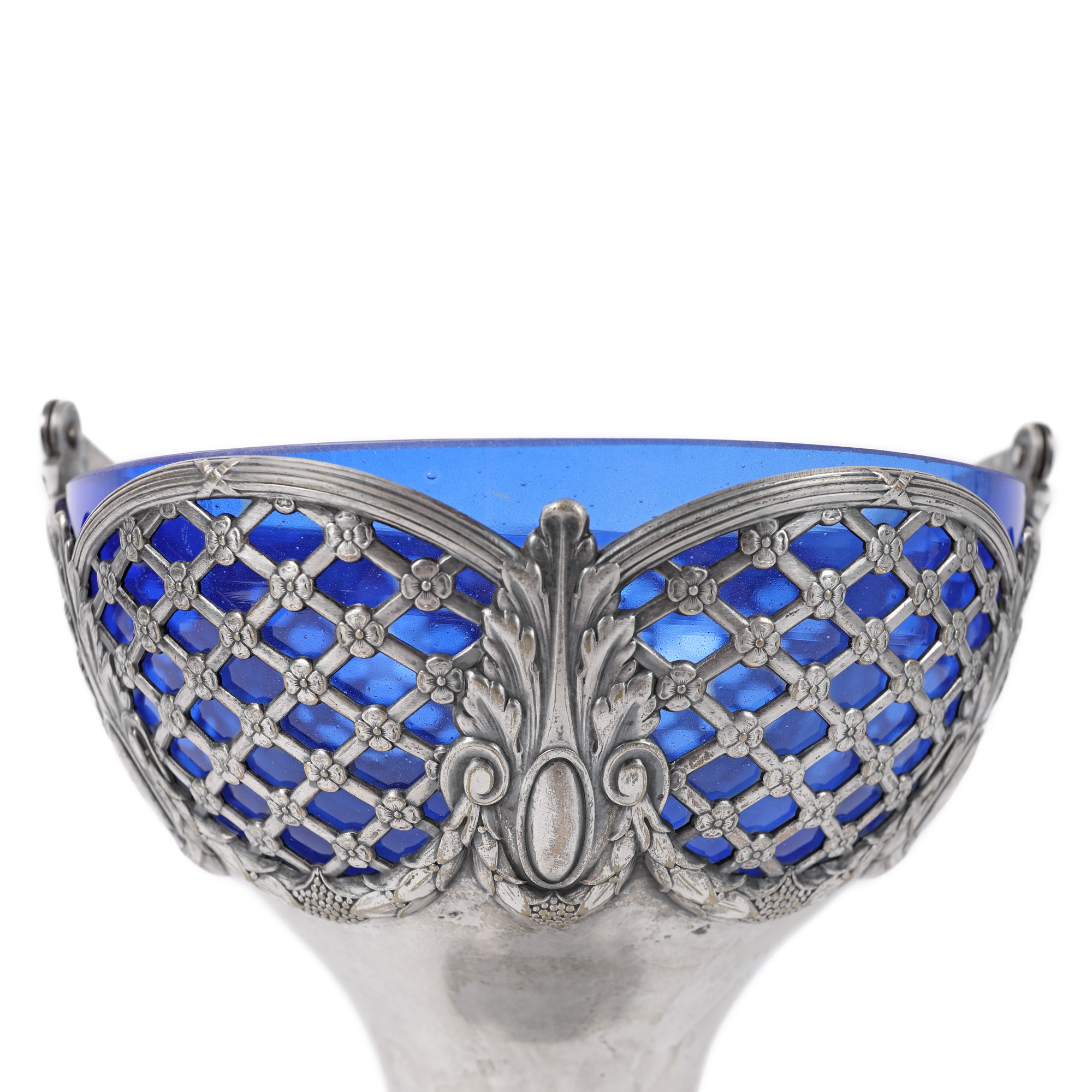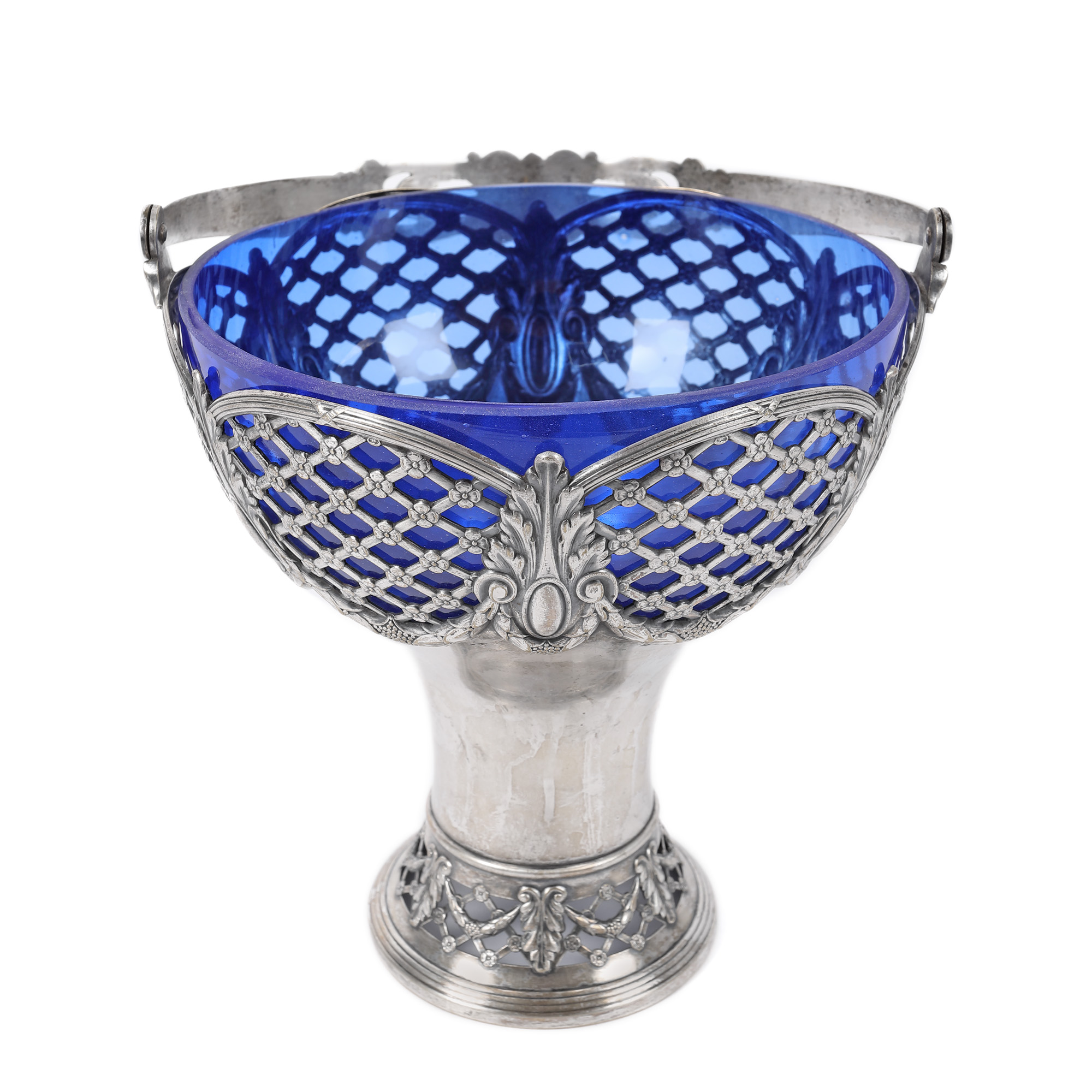 29. Fructieră WMF cu ansă, cu bol din sticlă cobalt, decorată cu elemente Neoclasice, cca. 1910-1920