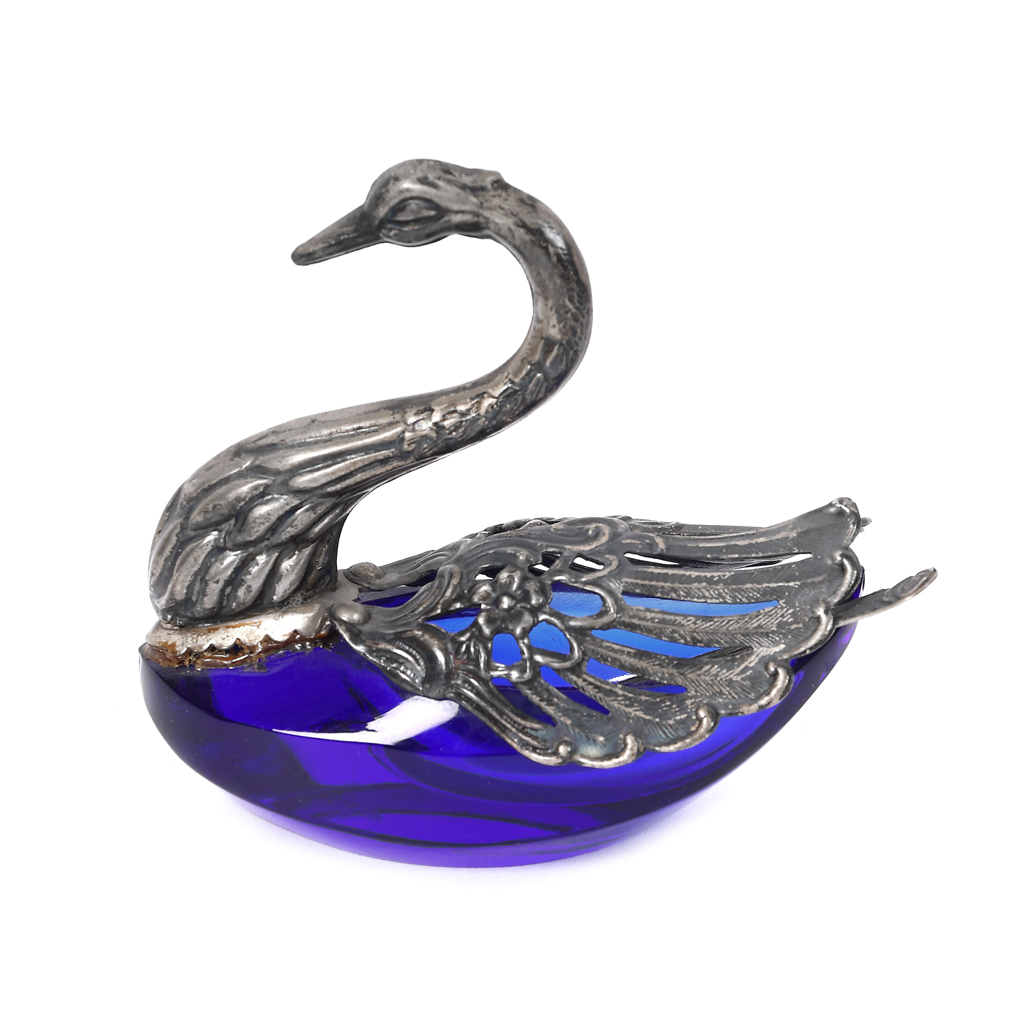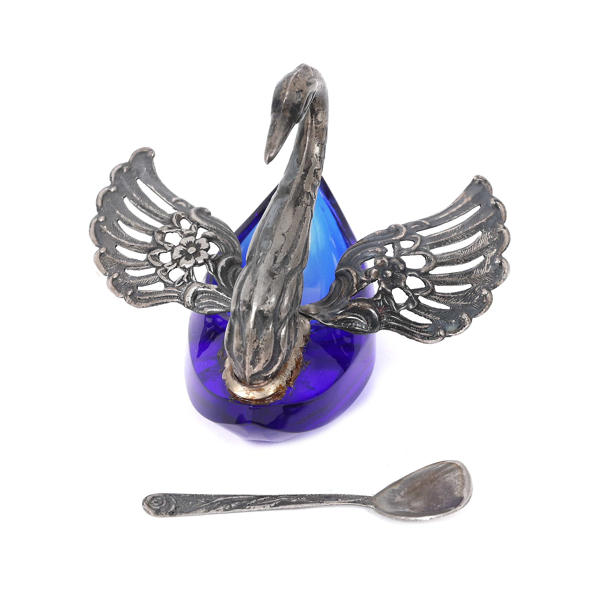 32. Pereche de solnițe din argint și cristal cobalt, în forma unor lebede [Sec. XX]