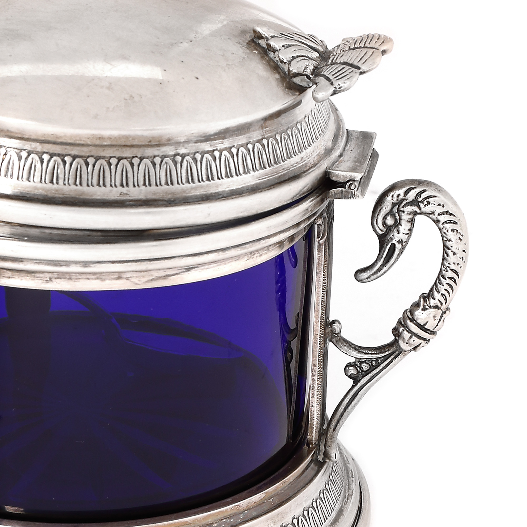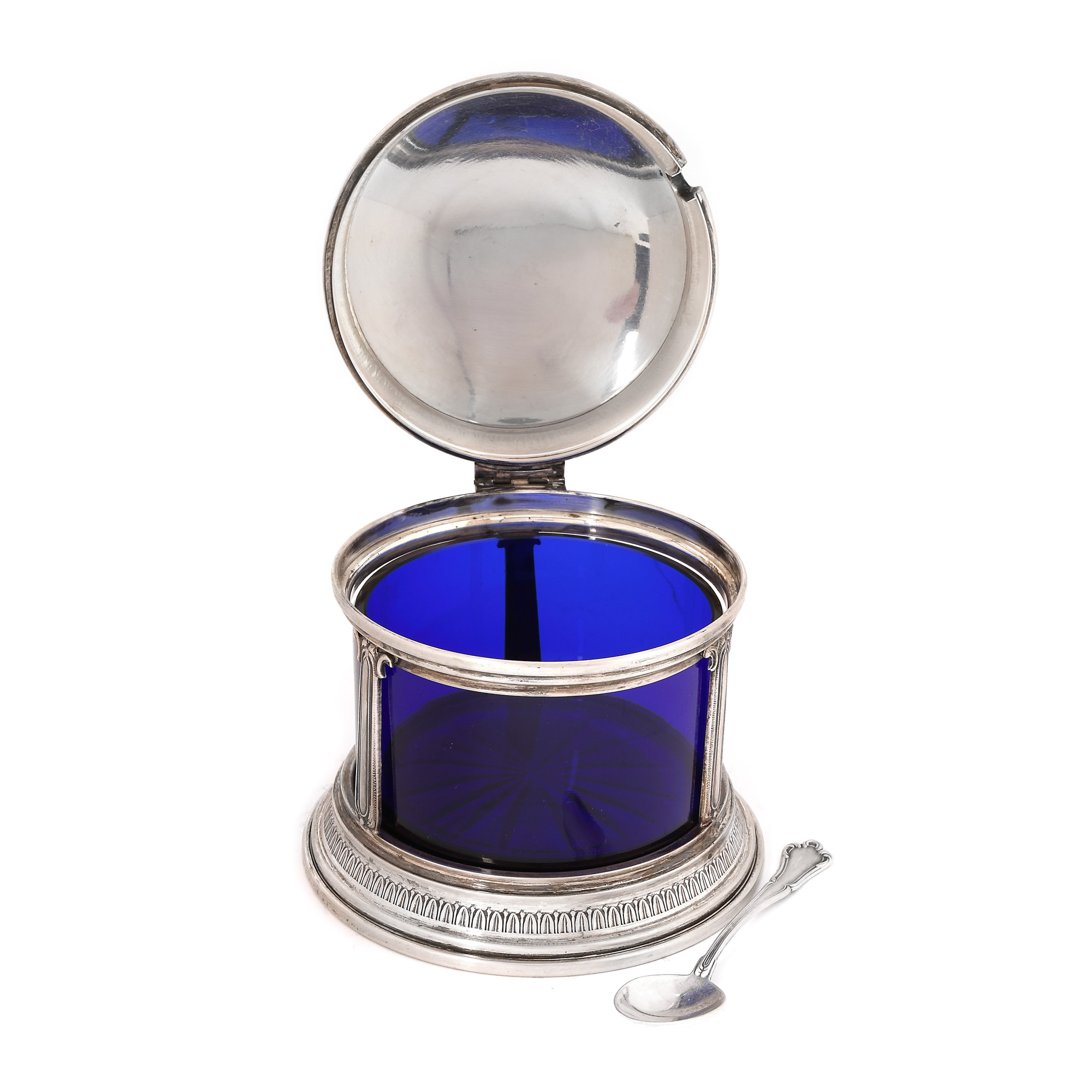 25. Recipient pentru parmezan, cu linguriță, din argint și sticlă cobalt, atelier Eugenio Stancampiano [Cca. 1950-1960]