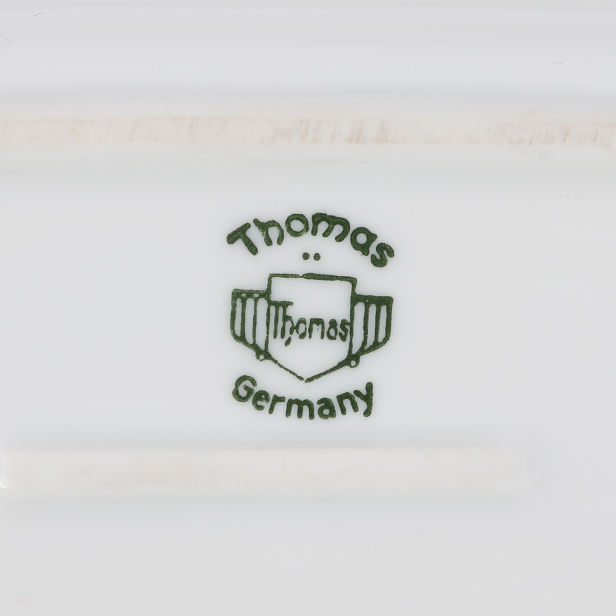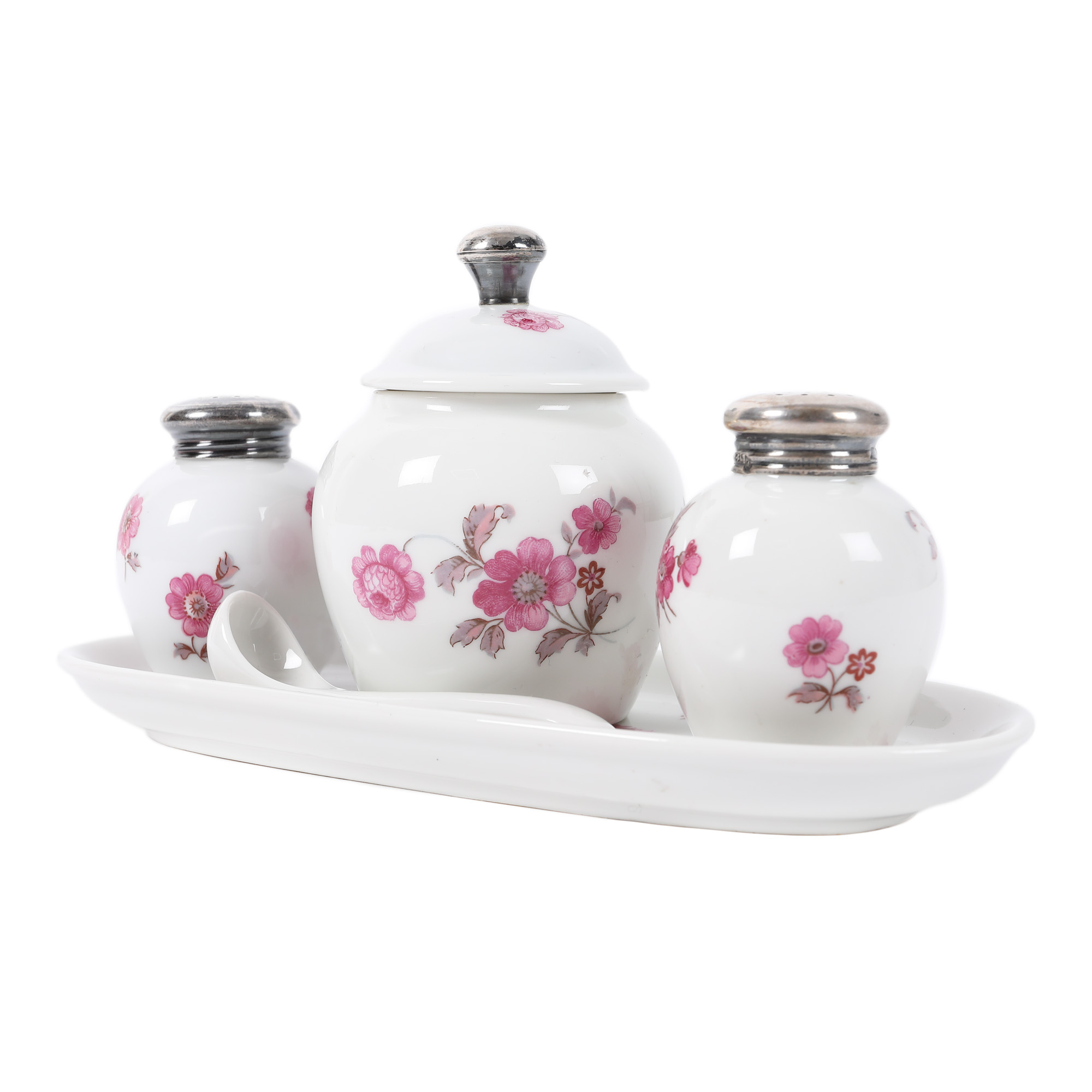 1. Serviciu pentru condimente din porțelan Thomas și argint Hermann Bauer, format din tavă, pereche de solnițe și recipient cu linguriță pentru muștar [Cca. 1950]