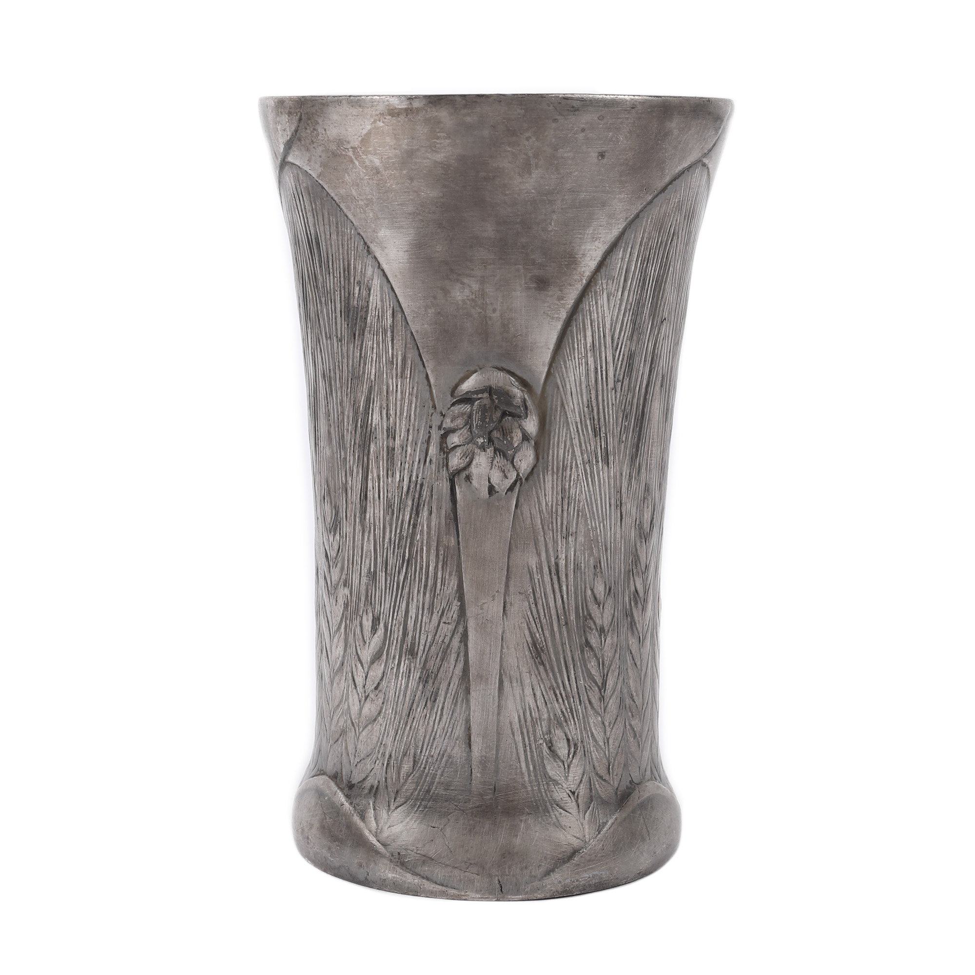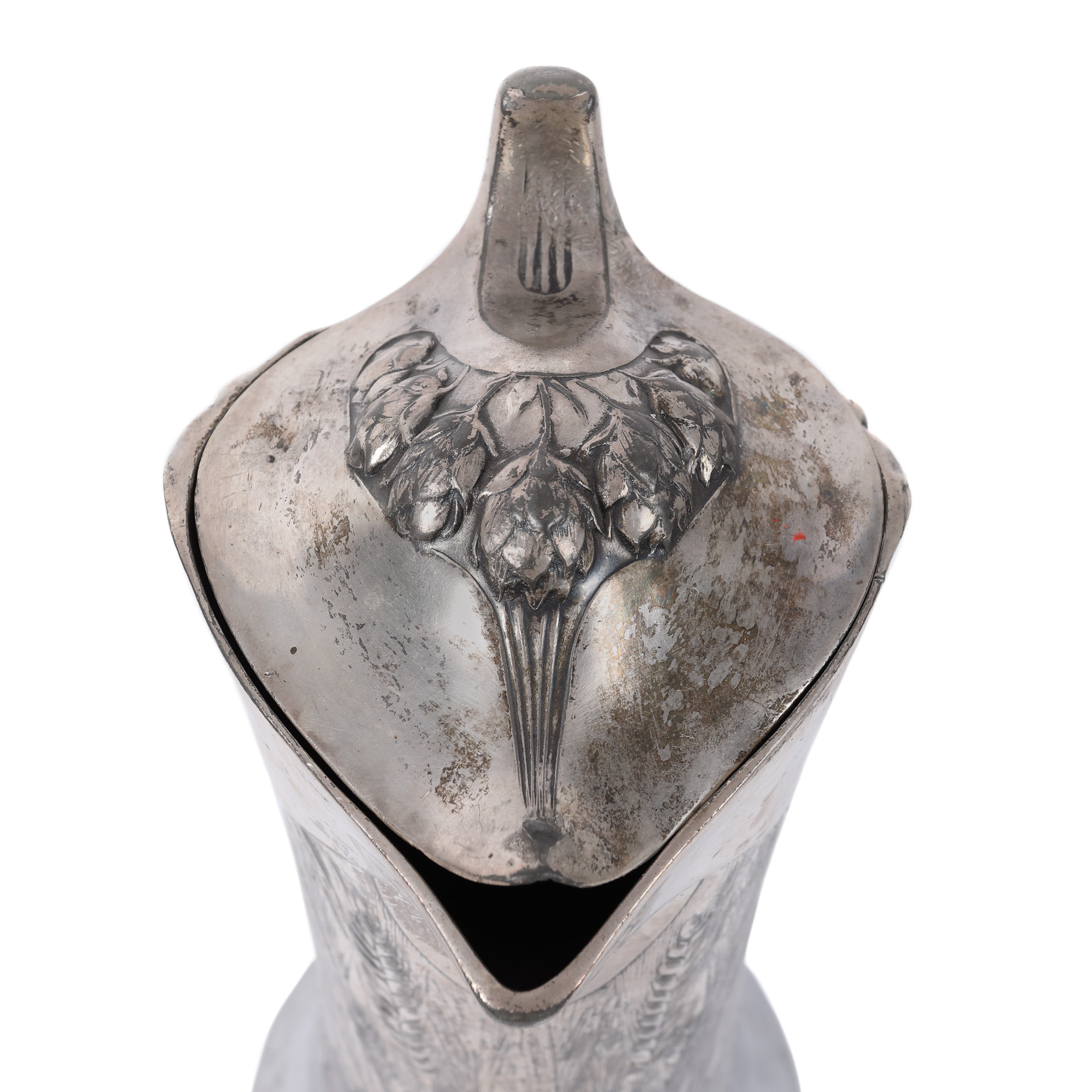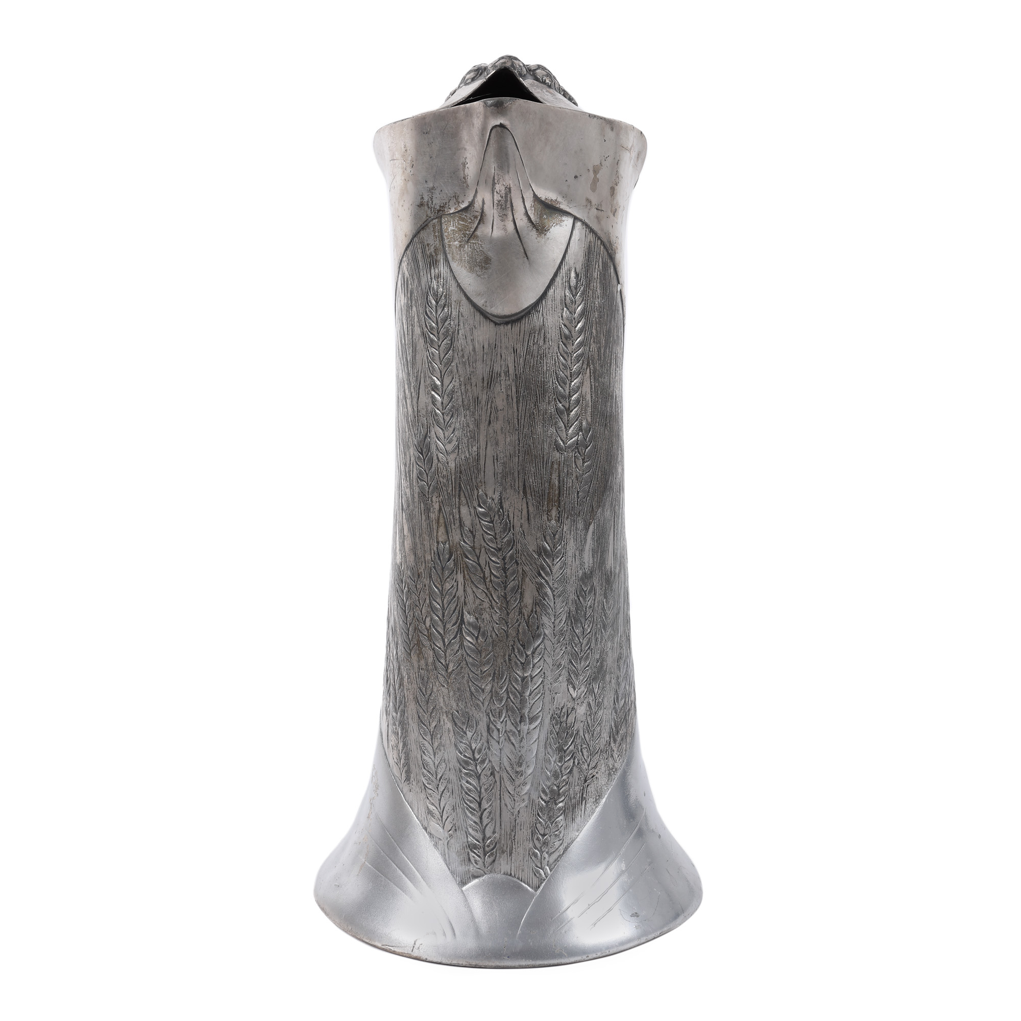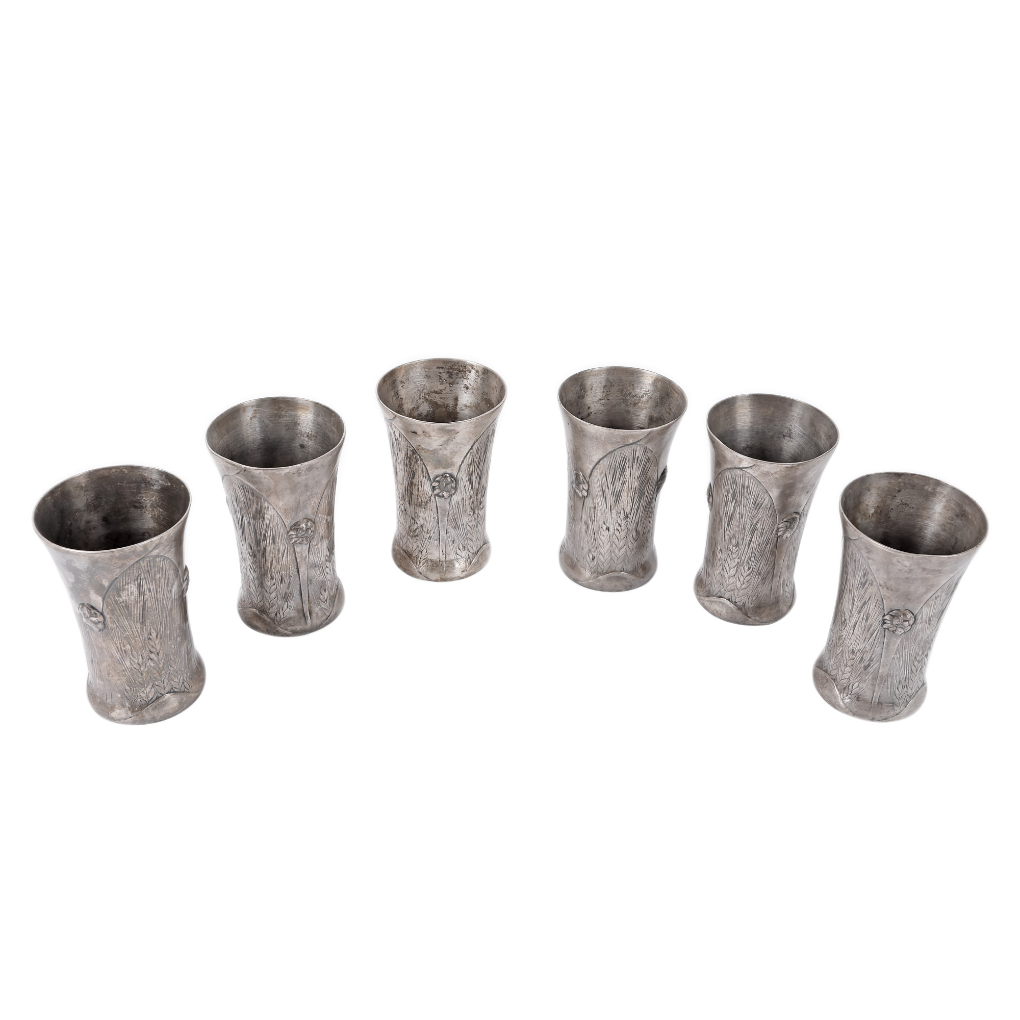 14. Set Christofle în stil Art Nouveau, format din carafă cu șase pahare, decorat cu spice de grâu, manufactura l’Alfénide, începutul sec. XX