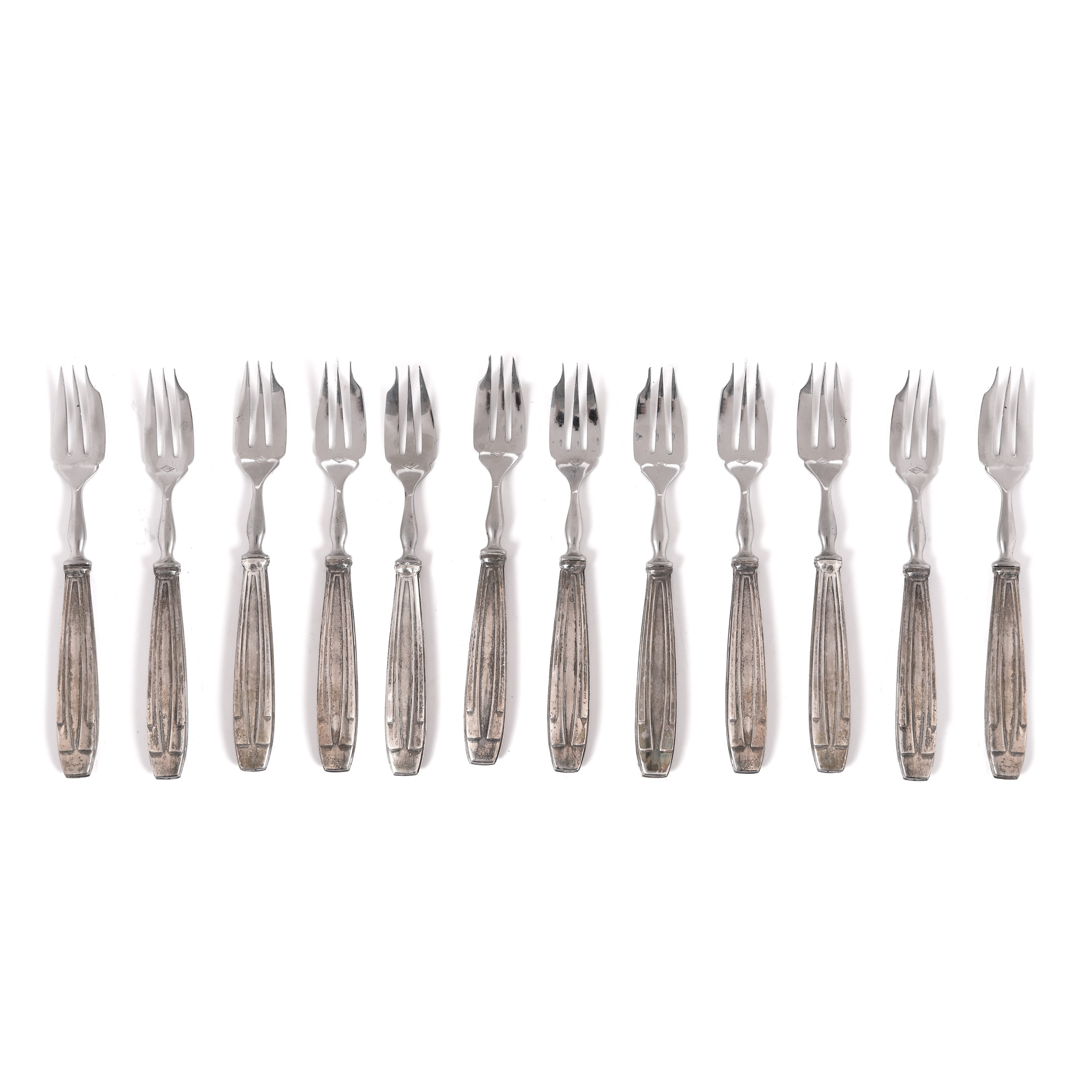 26. Set format din 12 furculițe Art Deco din argint, pentru desert, cca. 1920-1930, însoțit de cutie originală