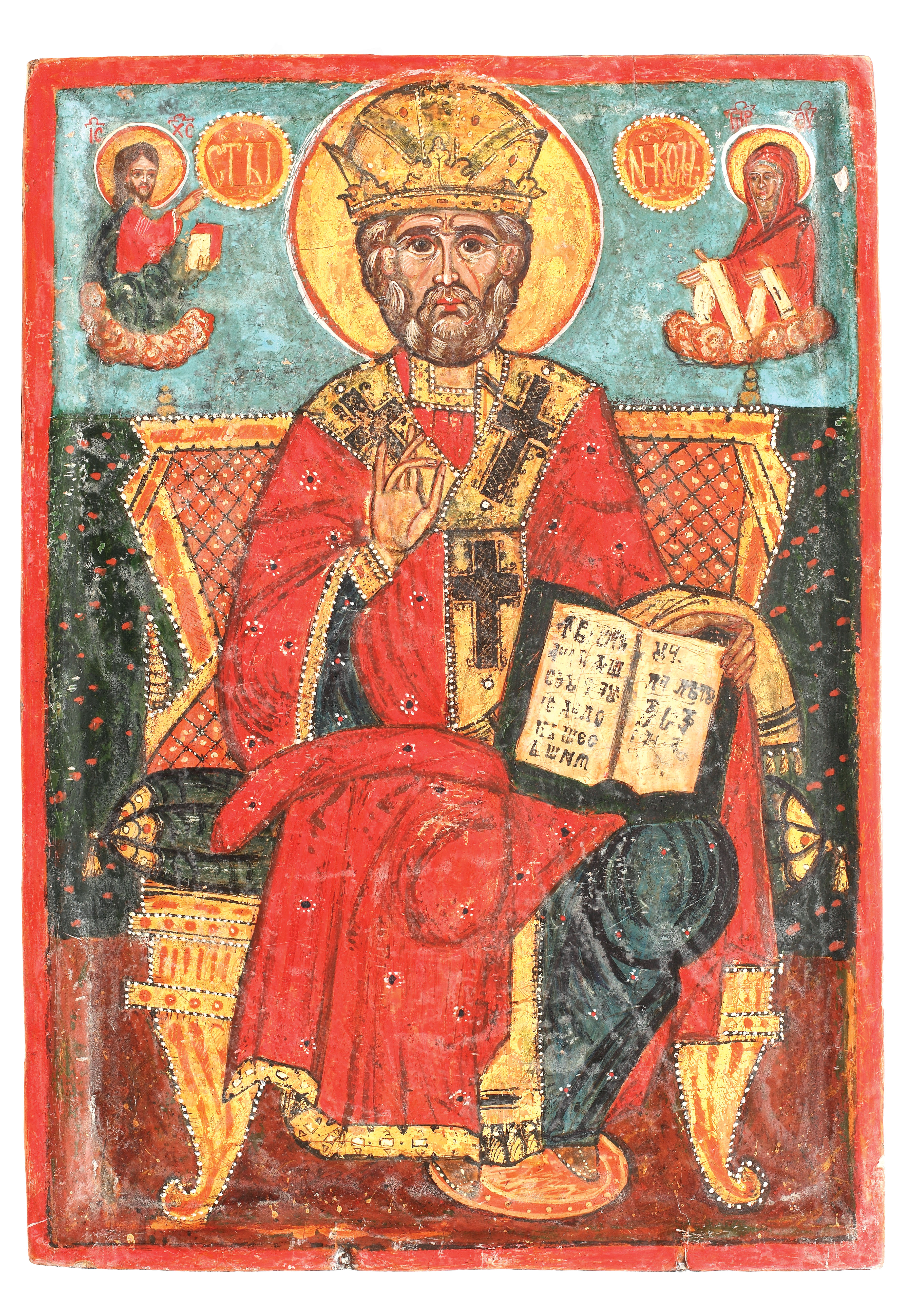 38. Icoană împărătească pe lemn, "Sfântul Nicolae pe tron", Ţara Românească, şcoală postbrâncovenească, a doua jumătate a sec. XIX