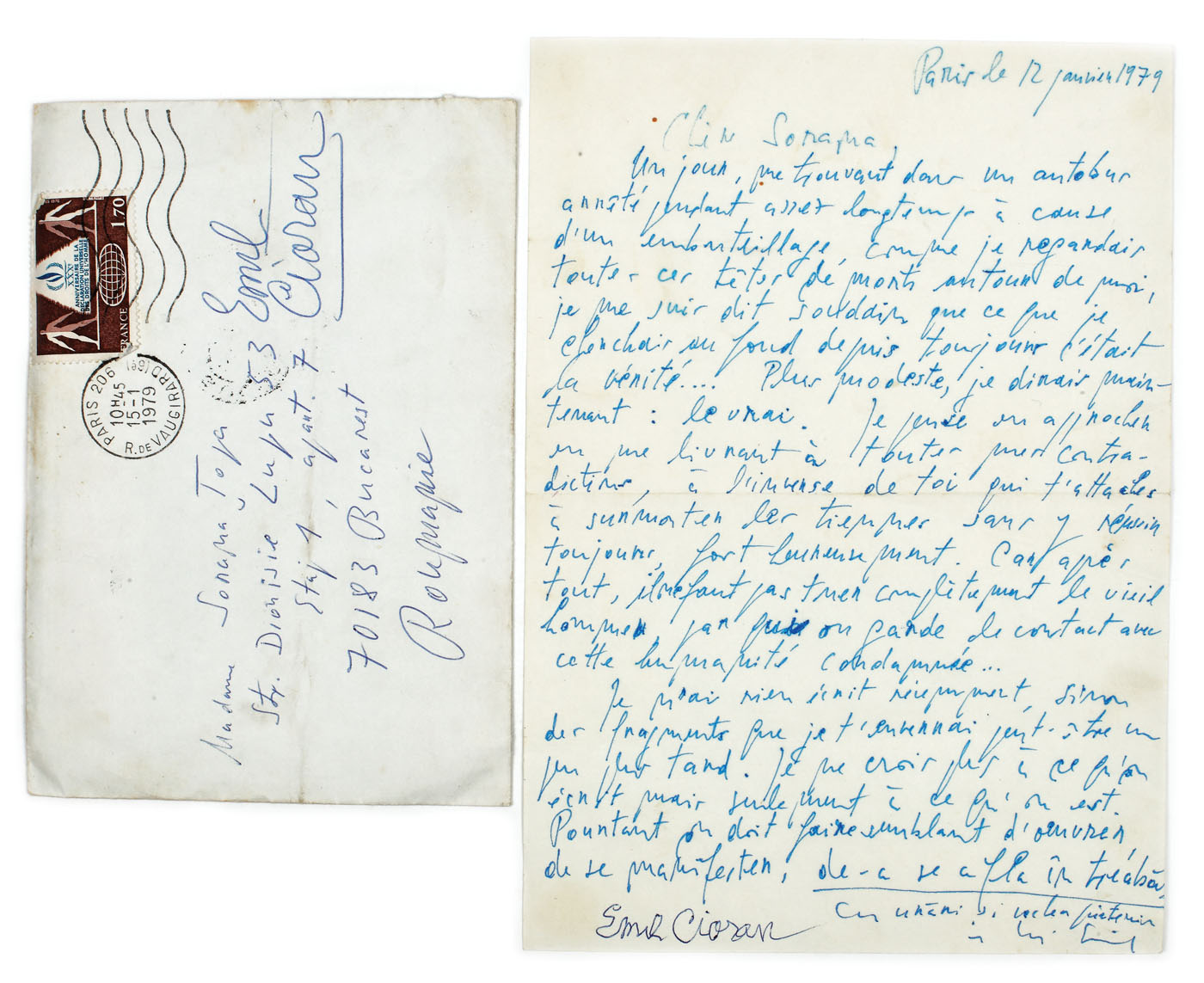 35. Cartonaşe-manuscris Emil Cioran, română, despre ideea sinuciderii (2 cartonașe-file)