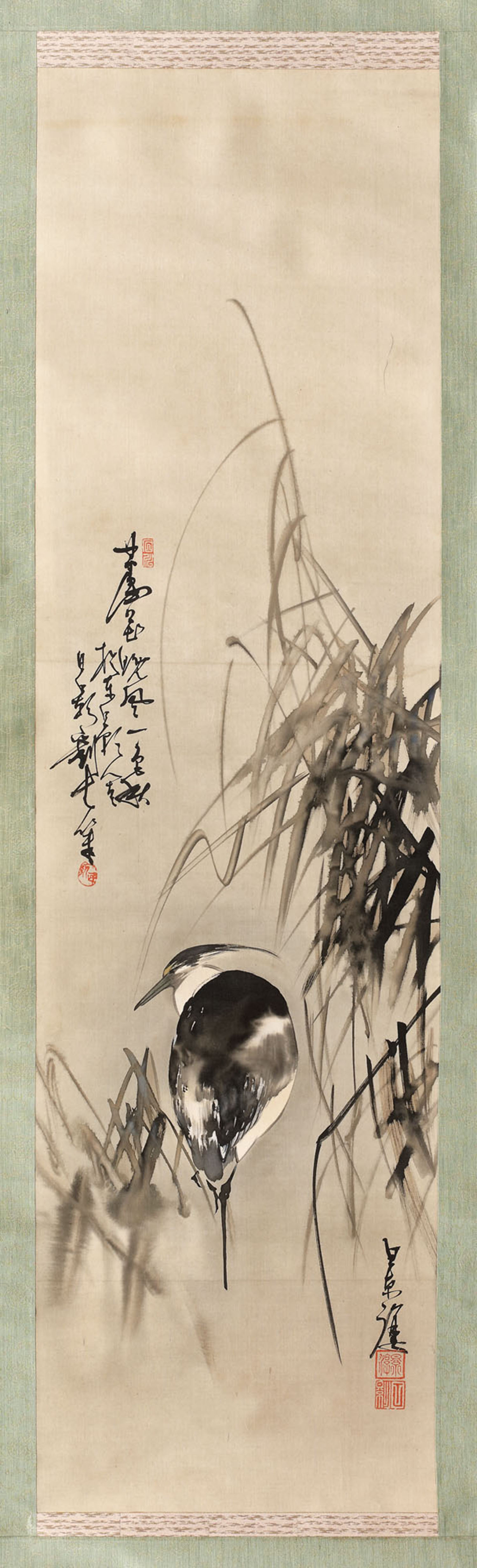 Pictura, care înfățișează o egretă printre trestii, executată în tehnica tradițională japoneză pe mătase, reprezintă o sublimă transpunere a unui motiv clasic, care ne amintește, fără îndoială, de pictura de influență chineză a pictorilor literați, într-o prelucrare modernă, specifică primei părți a secolului al XX-lea. Pictura literaților sau, așa cum mai este ea cunoscută, a școlii Bunjinga, îmbina, precum în cazul lucrării de față, într-un mod organic și subtil, pictura cu arta caligrafiei și a poeziei. Artistul a dat dovadă, în cadrul unei compoziții monocrome, de o uluitoare virtuozitate artistică, atât în minunata redare a grațioasei păsări cât și a expresivei trestii. Calmul degajat de egretă este asociat în cultura extrem orientală cu idea de eliberare a minții și de liniștire a spiritului, în vederea obținerii unei acuități a simțurilor.