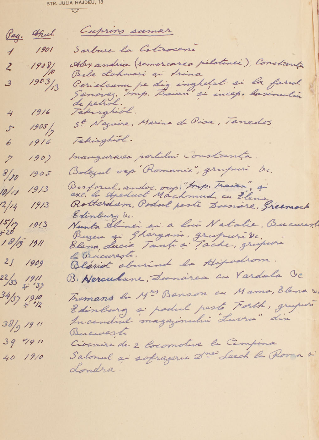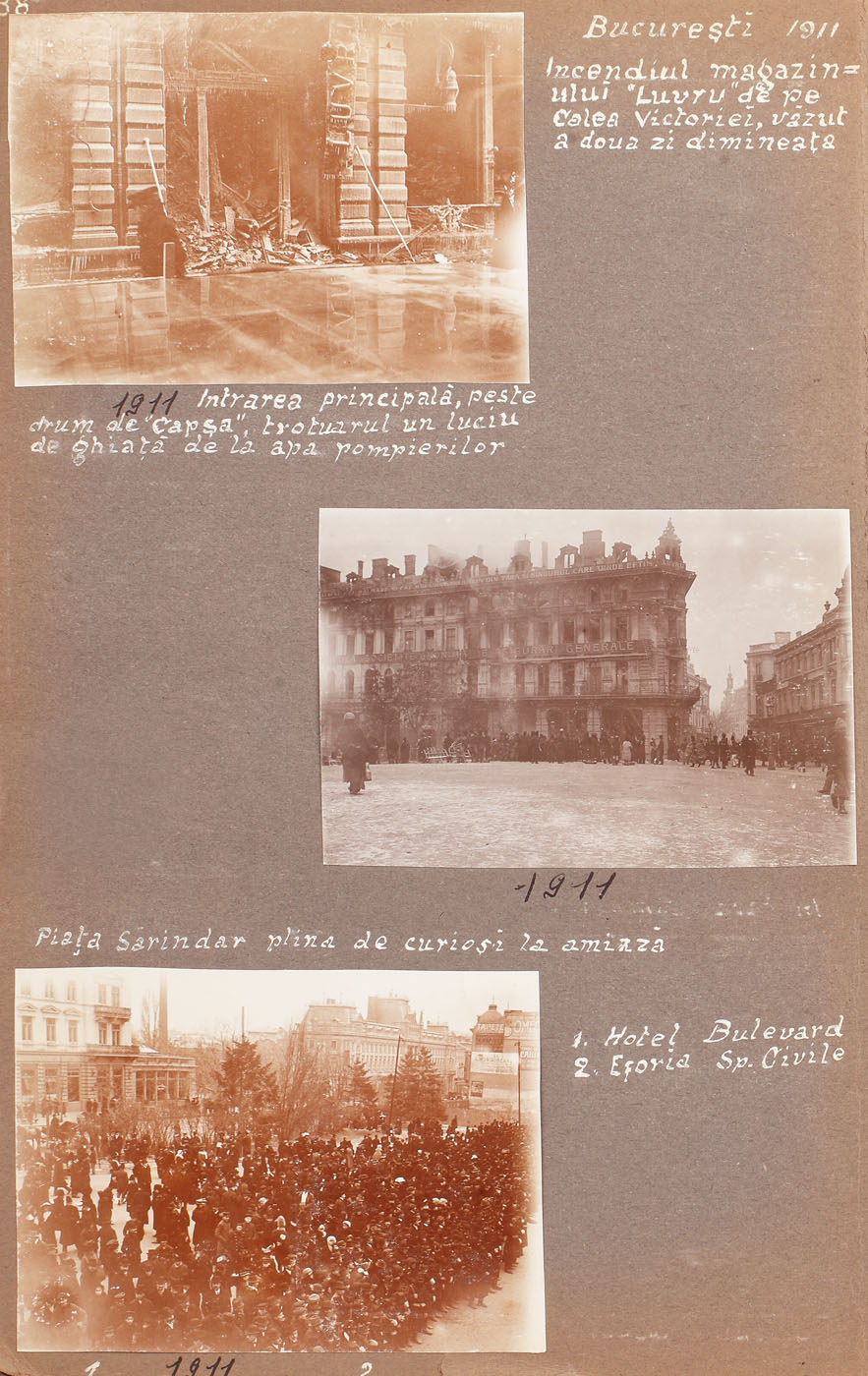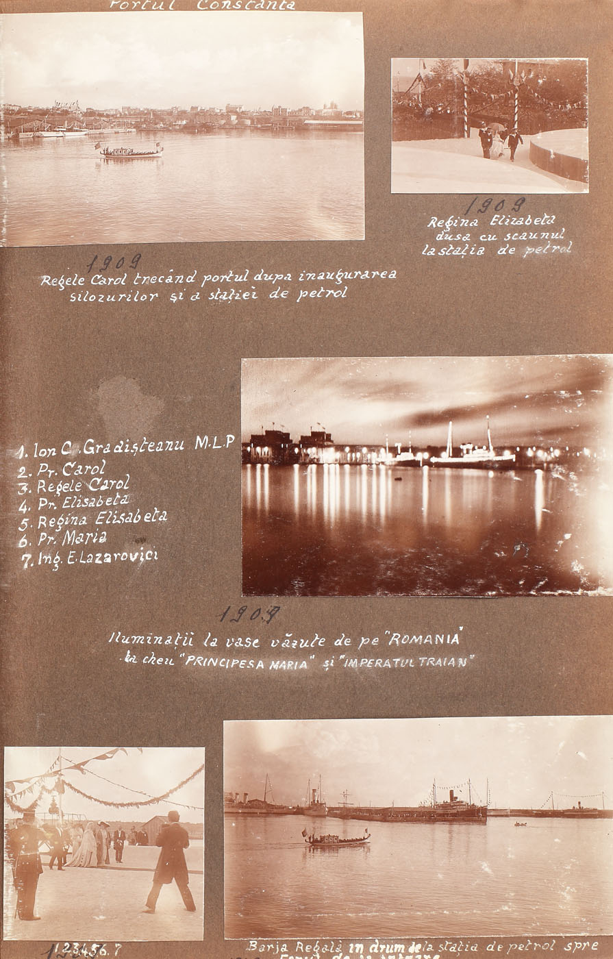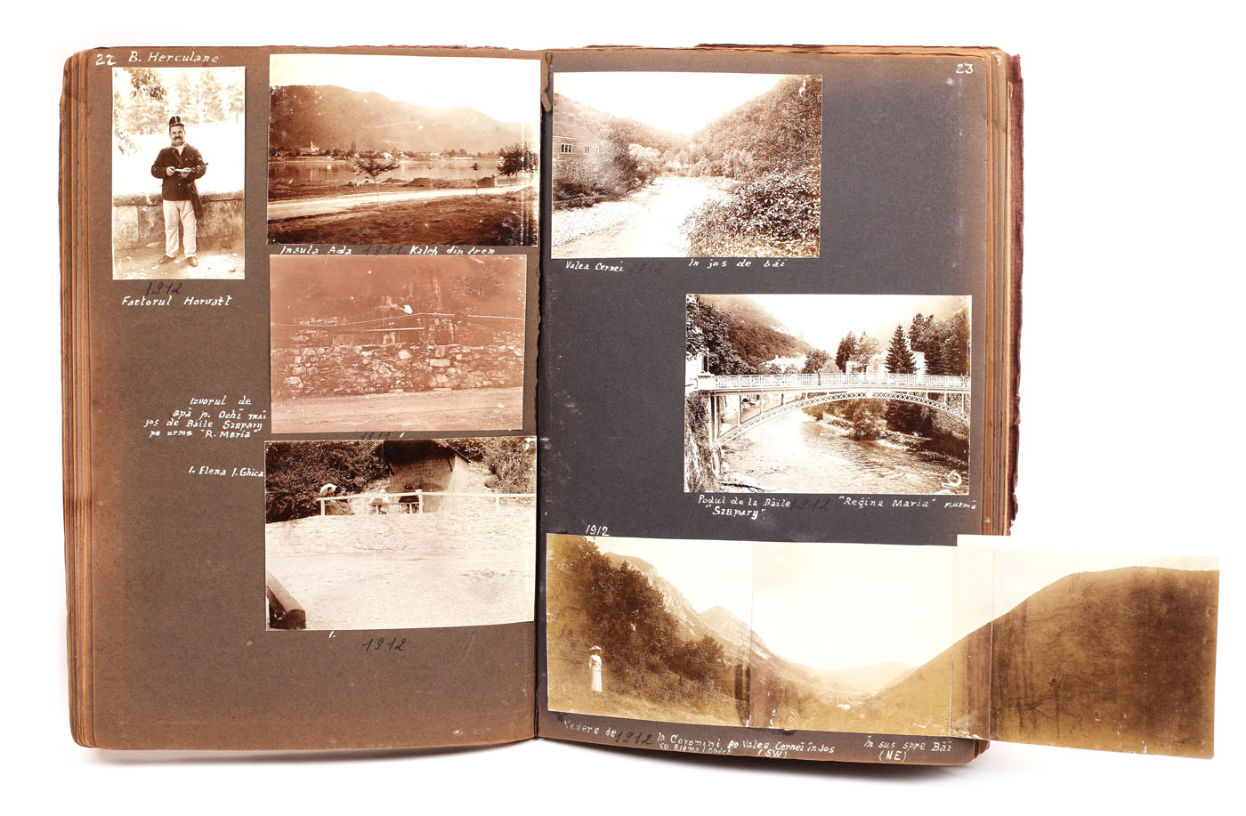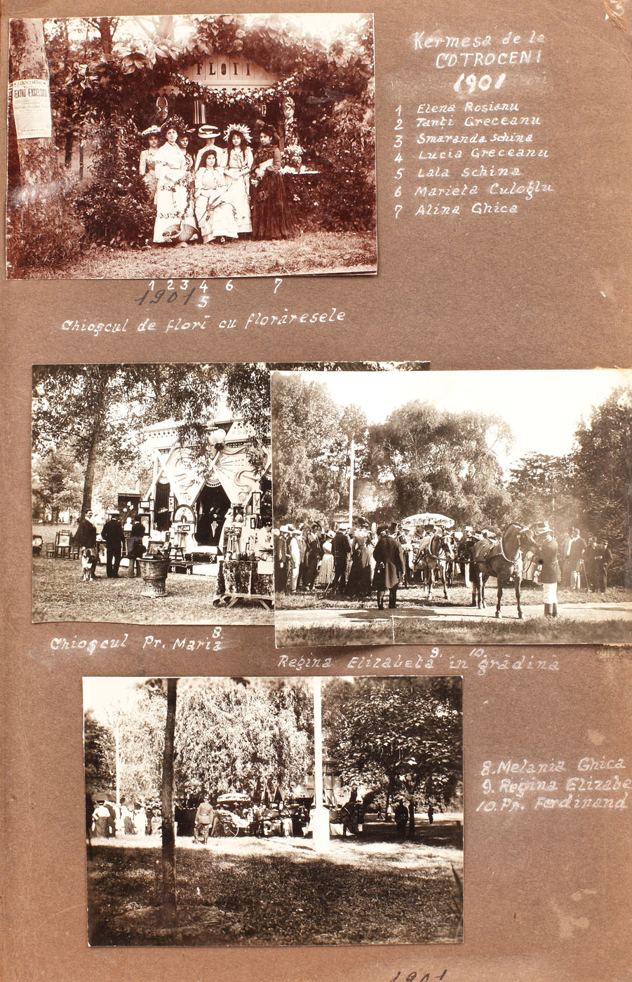 Albumul cuprinde serbarea din parcul palatului Cotroceni, "kermesa" din 1901 (chioşcul Prinţesei Maria, realizat în stil Art Nouveau, Regina Elisabeta într-o trăsură acoperită, alături Regele Carol I, Prinţul Ferdinand), Vizita Regelui Carol I, a Reginei Elisabeta în Portul Constanţa, 1909, cu ocazia inaugurării silozurilor şi a staţiei de petrol (într-o fotografie Regina Elisabeta este dusă cu scaunul la staţia de petrol). Botezul vasului "România" (Constanţa,1905), festivitate la care au participat Regele Carol I, Regina Elisabeta, Prinţul Ferdinand, Prinţesa Maria. Fotografii cu un zbor al aviatorului Louis Bleriot la Bucureşti (1909), Băile Herculane (1911, 1912), Tremans (1910), incendiul magazinului Luvru din Calea Victoriei (1911), Rotterdam (1913), podul de la Cernavodă (1913), Techirghiol (1916). Fotografiile reprezintă, totodată şi o importantă sursă istorică documentară.