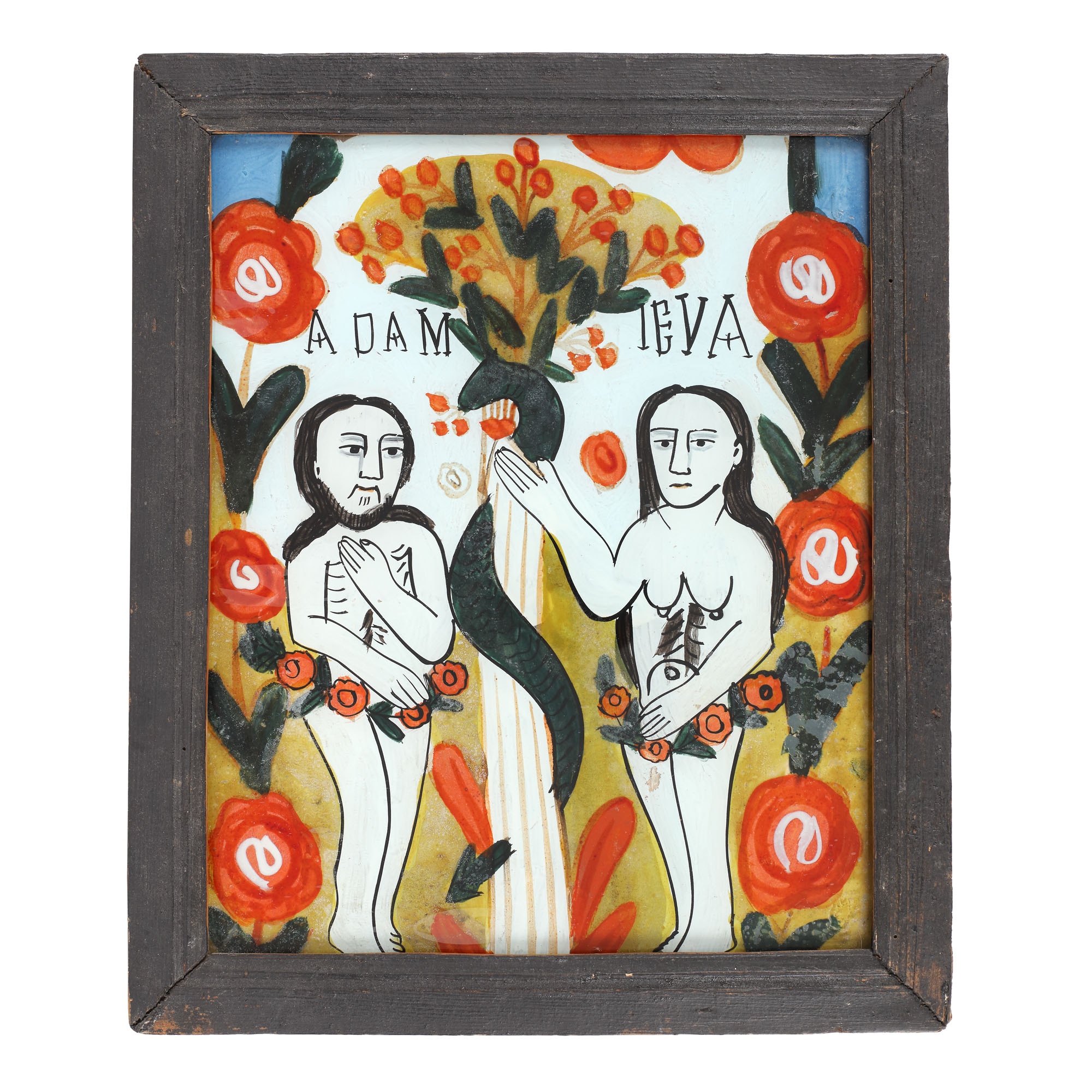 27. Icoană pe glajă, "Adam şi Eva în Rai", școală transilvăneană (Gherla), începutul sec. XX