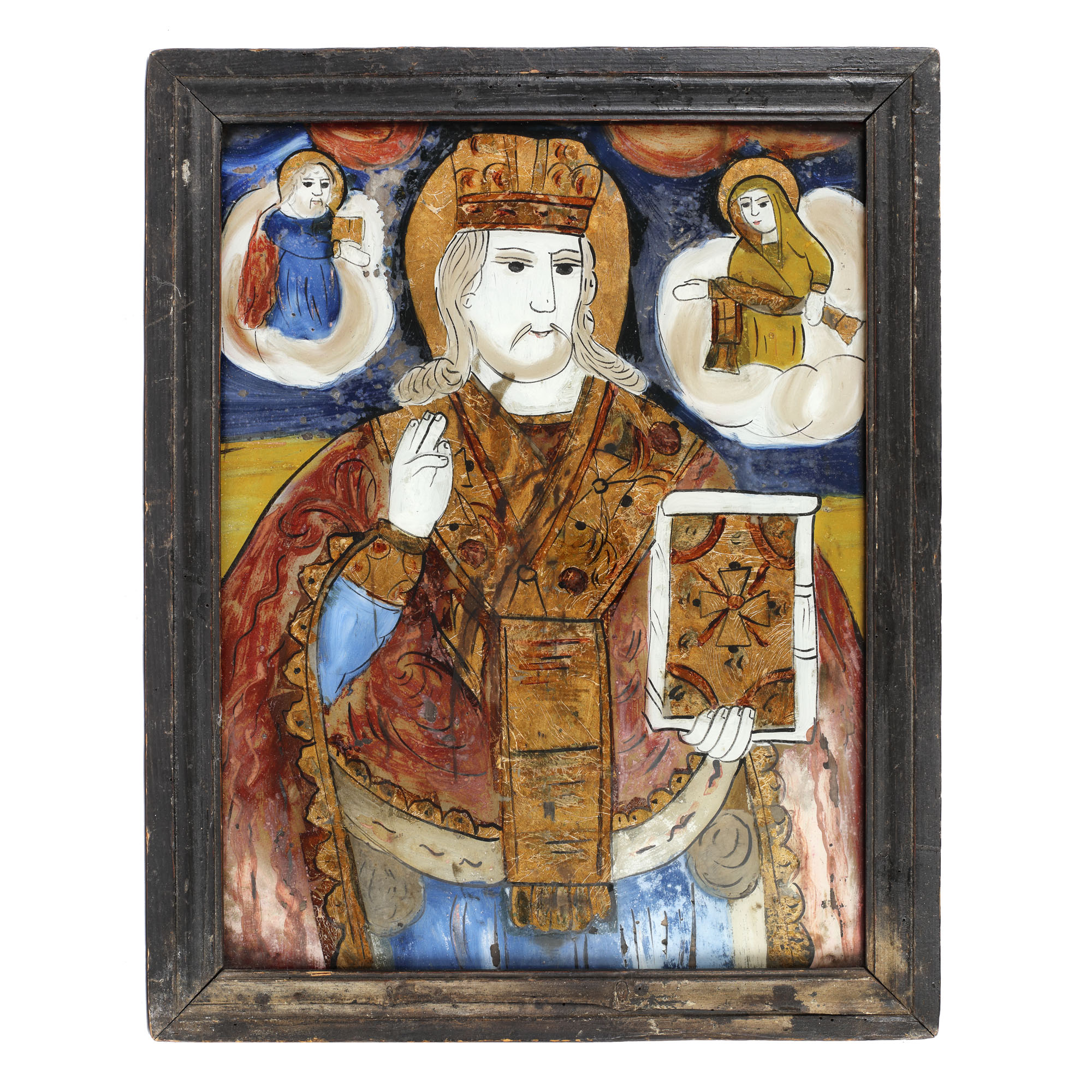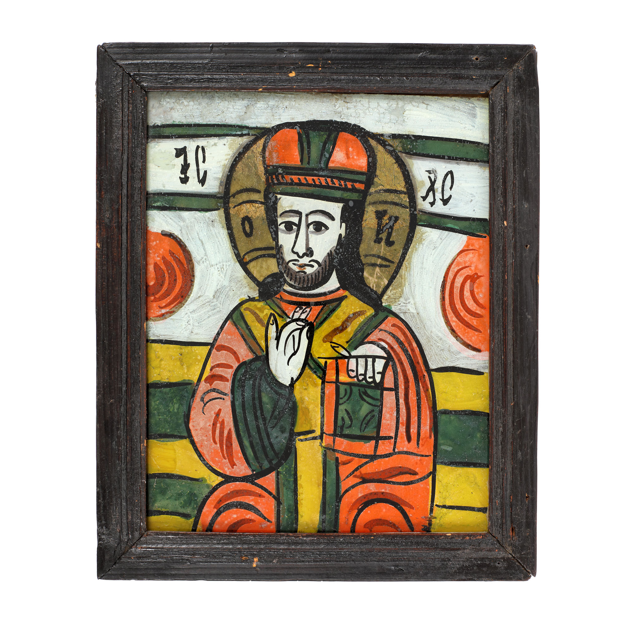 25. Icoană pe glajă, ”Iisus Pantocrator”, atelier transilvănean (Nicula), sfârșitul sec. XIX