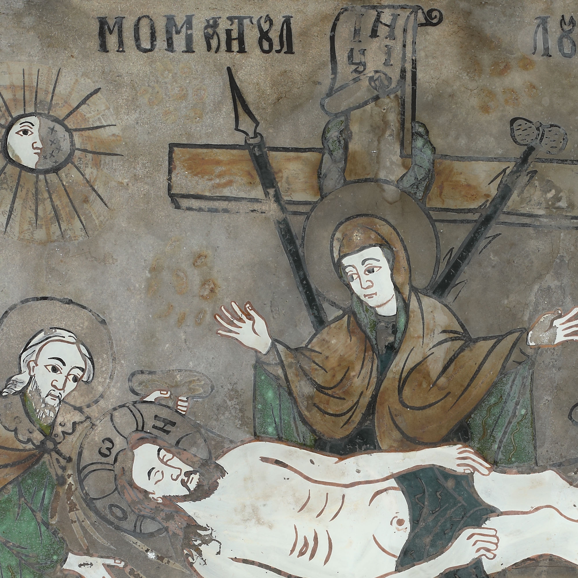 Scena se desfăşoară pe lăţimea icoanei. Iisus este culcat pe linţoliu, cu ochii închişi are aureolă crucigeră cu însemnele specifice. Scena este străjuită de Crucea Răstignirii cu suliţa, buretele, coroana de spini şi rotulus cu iniţialele INRI. Giulgiul este ţinut la un capăt de de Iosif din Amariteea iar la celălalt de un apostol. În plan secund apare Fecioara Maria cu braţele deschise.