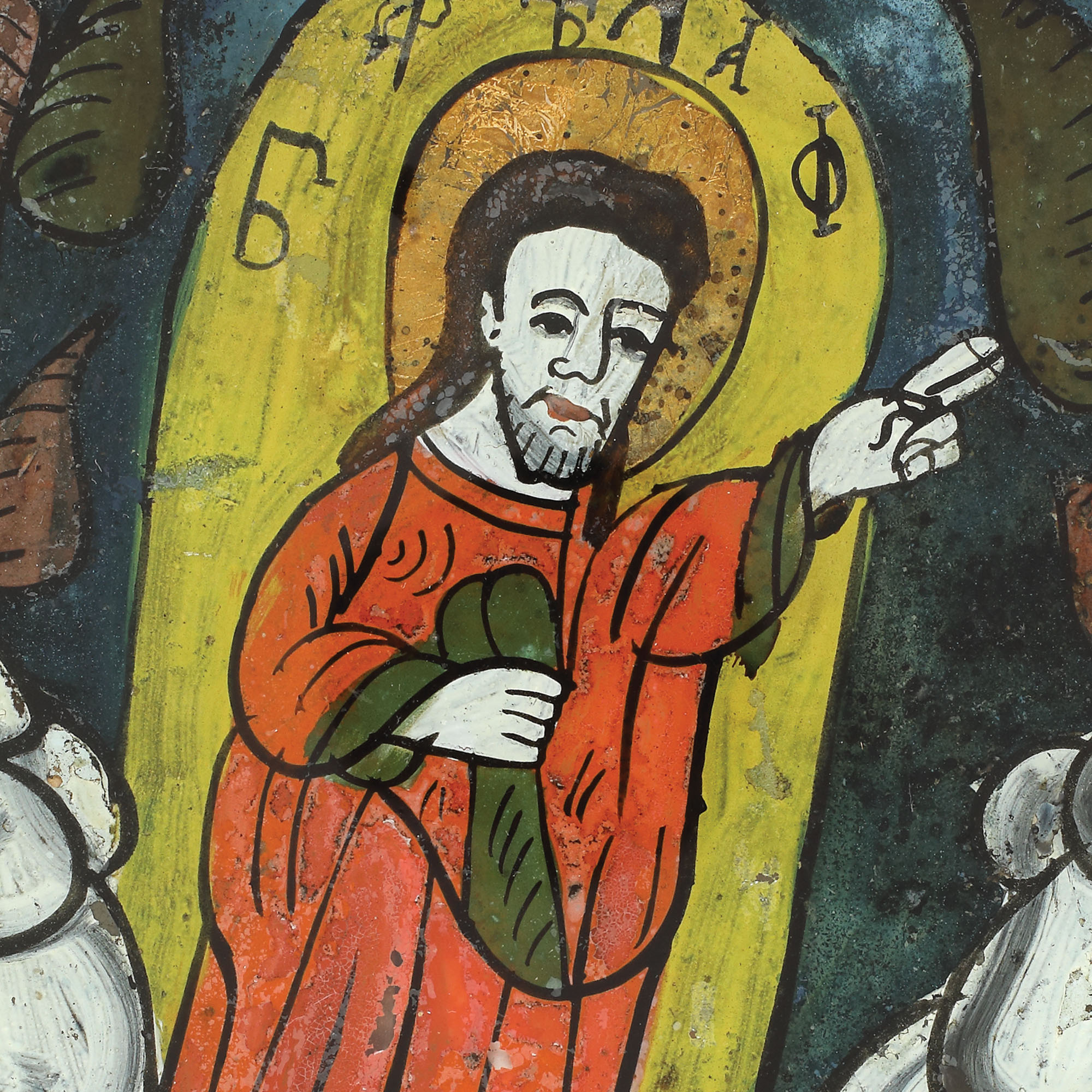 2. Icoană pe glajă, probabil ”Înălțarea Domnului”, atelier transilvănean (Nicula), sfârșitul sec. XVIII - începutul sec. XIX, raritate extremă, de colecție