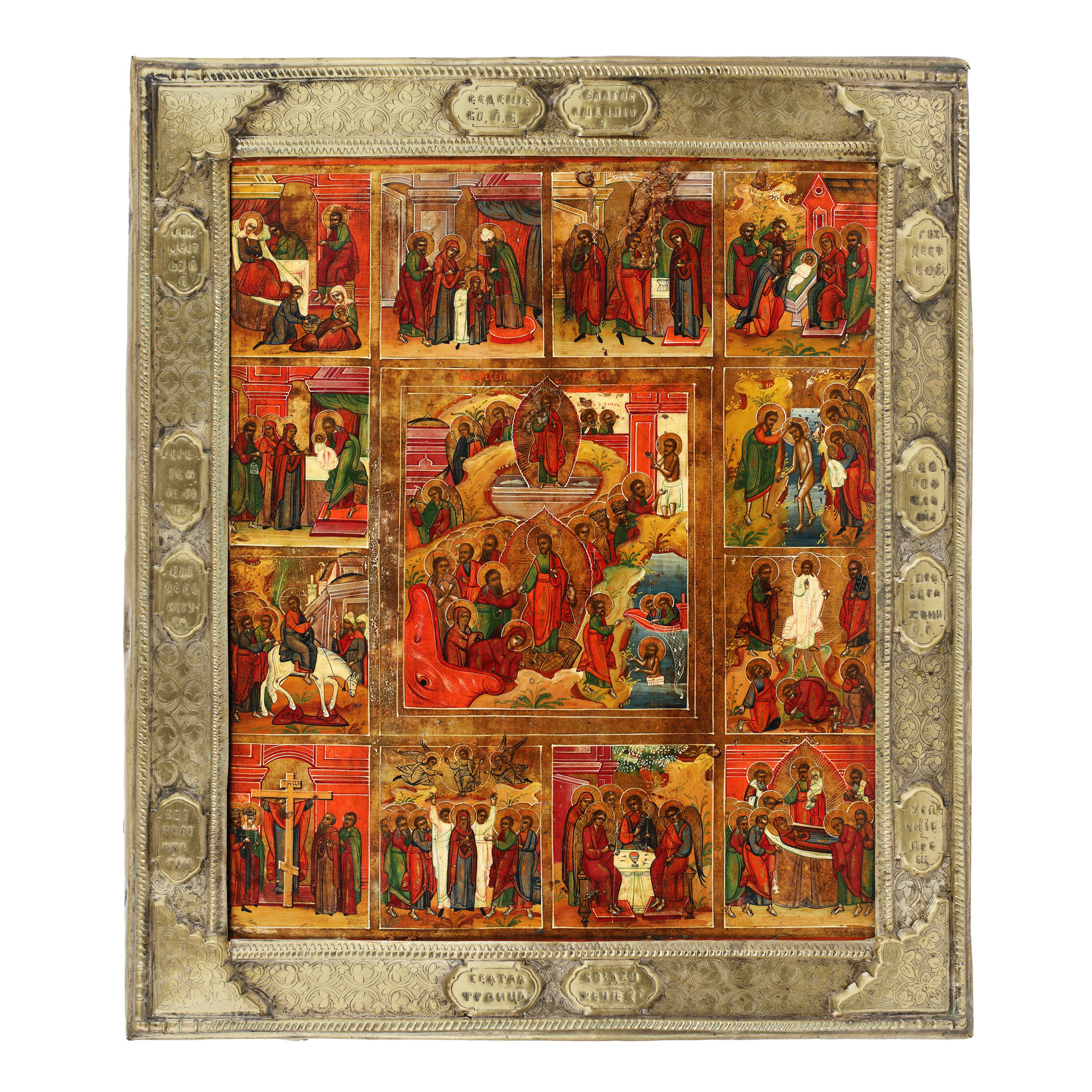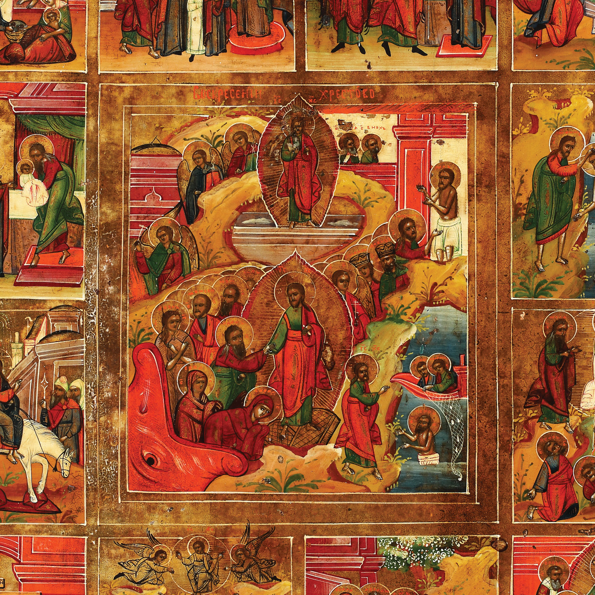 44. Icoană prăznicar pe lemn cu riză, "Învierea Domnului și 12 scene", școală rusească (Palekh), începutul sec. XIX