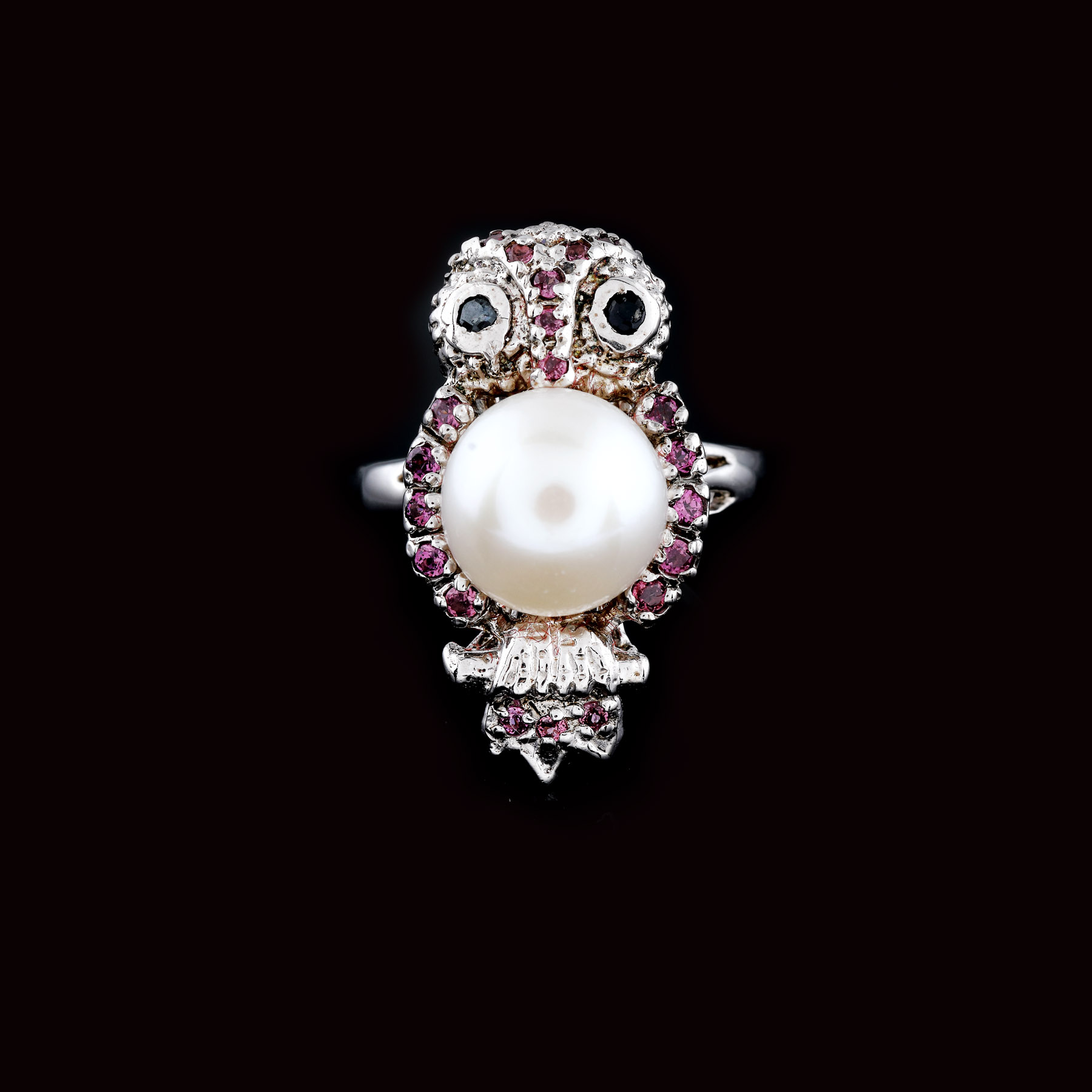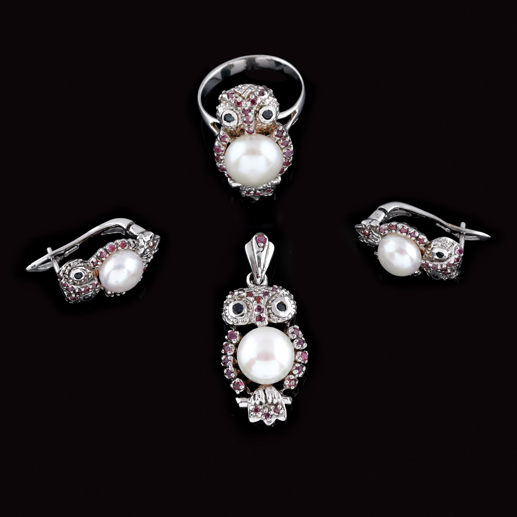 213. Set format din inel, pereche de cercei și pandantiv, model bufniță, decorat cu perle și pietre semiprețioase