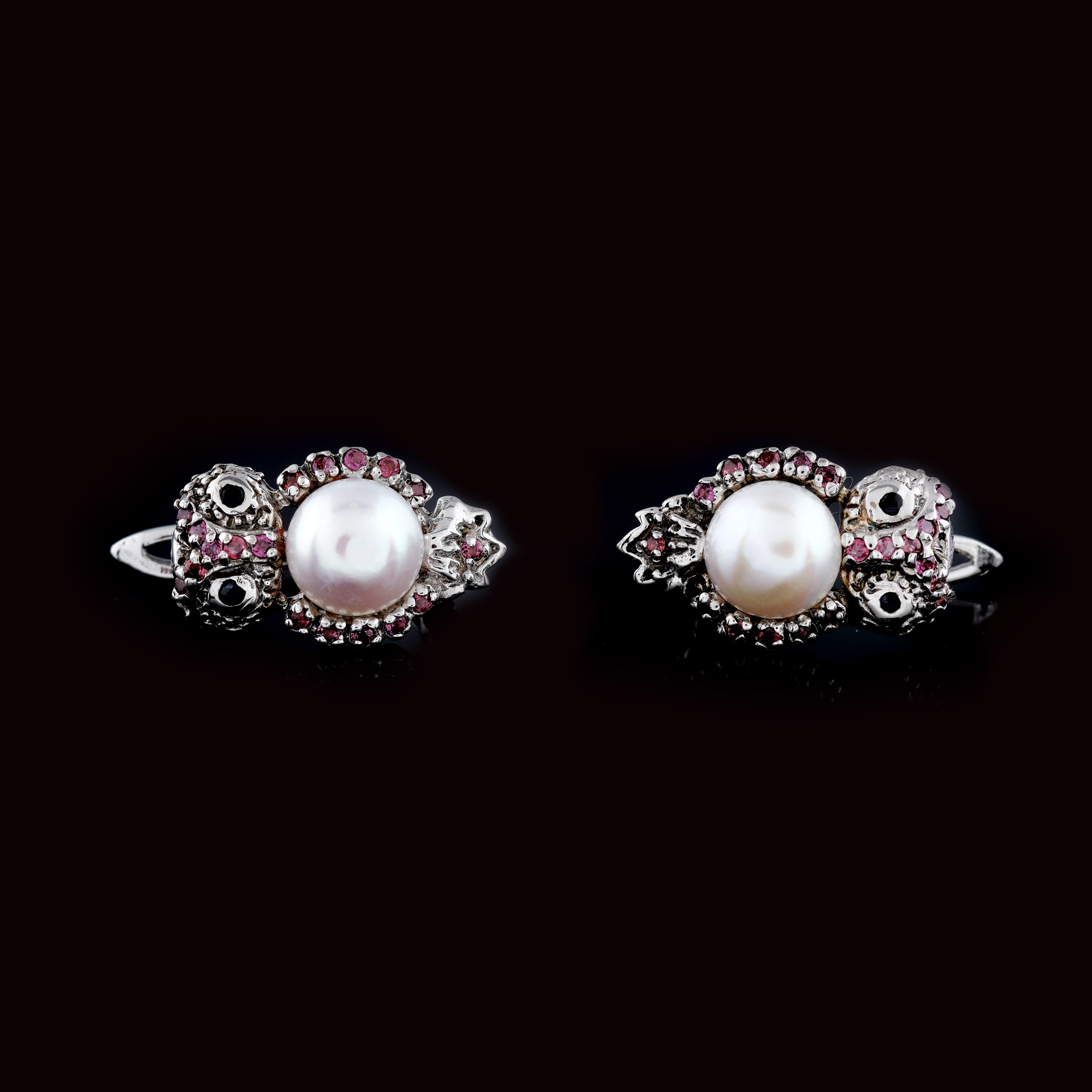 4 perle de cultură rotunde, albe, d=7,65-9,71 mm, 85 rodolite rotund fațetate, culoare roșu violet, claritate eye-clean, cca. 1 ct., 8 safire rotund fațetate, culoare albastru, claritate SI, cca. 0,36 ct