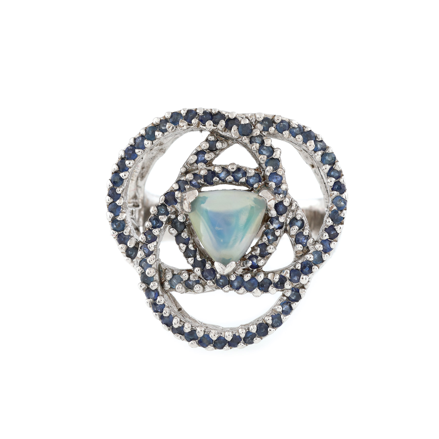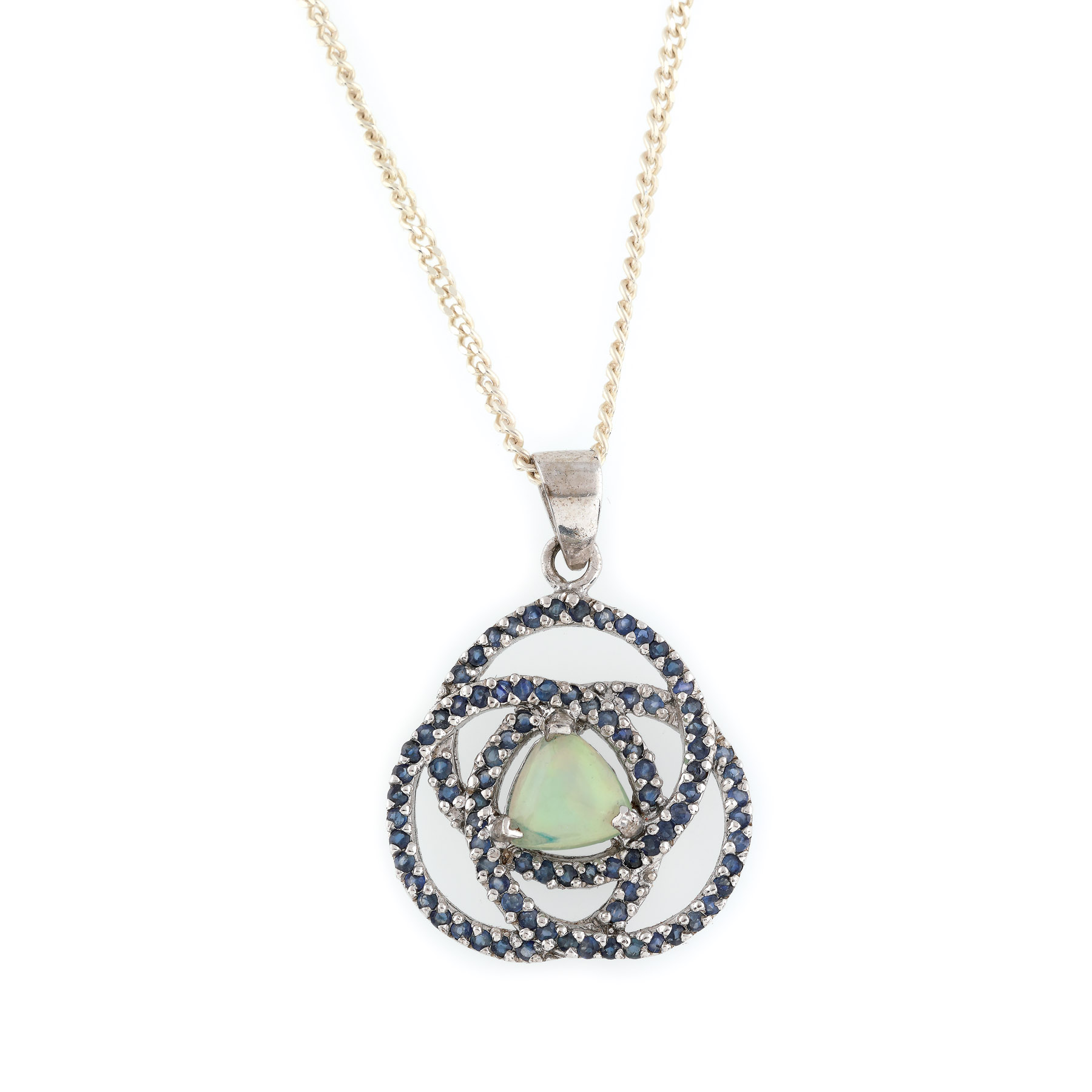 inel: 1 opal triunghiular caboșon, culoare albastru, cca. 0,7 ct.; 87 safire rotunde single cut, culoare albstru, cca. 0,7 ct.; pandantiv: 1 opal triunghiular caboșon, culoare albastru, cca. 0,7 ct.; 87 safire rotunde single cut, culoare albstru, cca. 0,7 ct.
