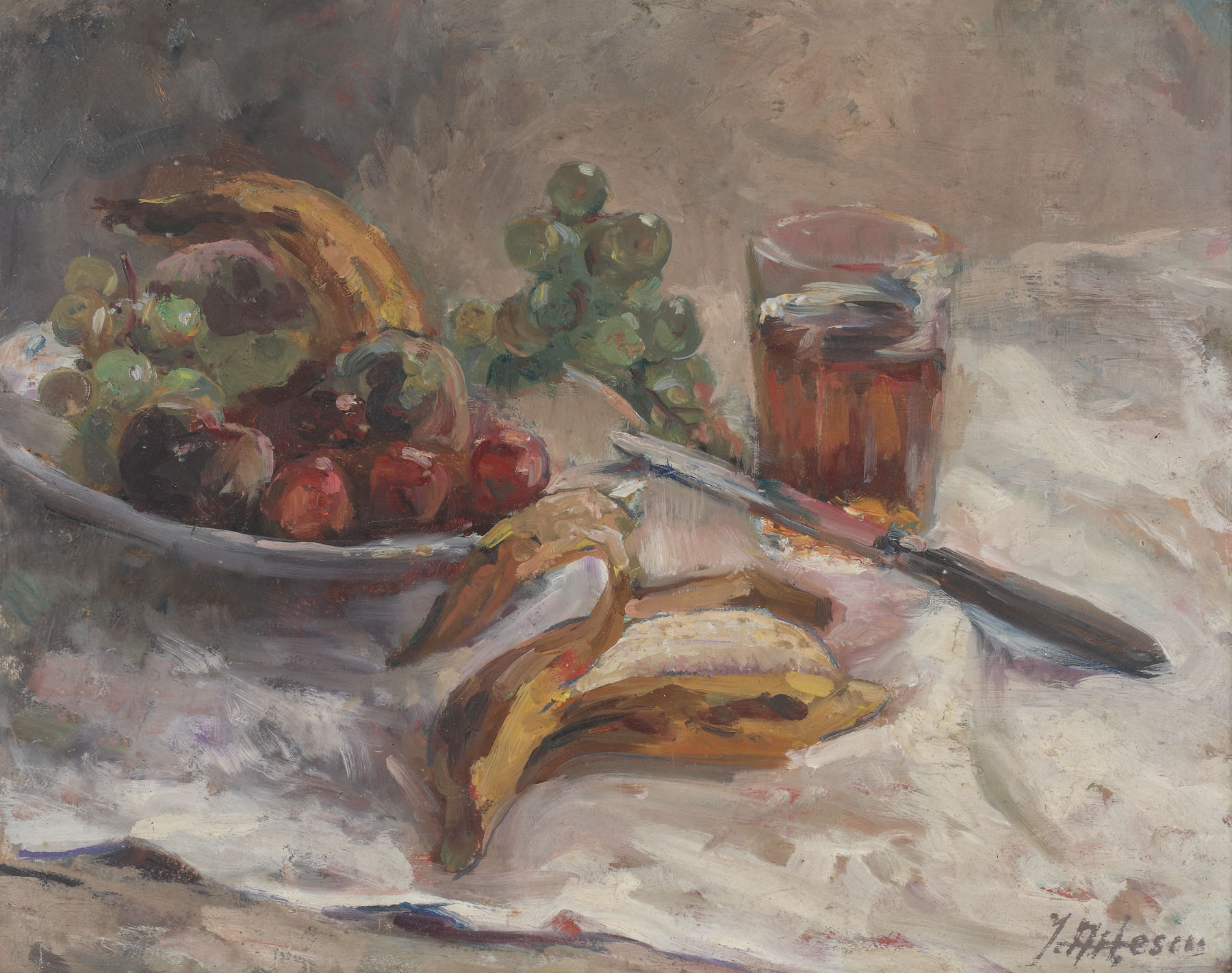337. Natură statică cu struguri, cuțit și pahar cu vin