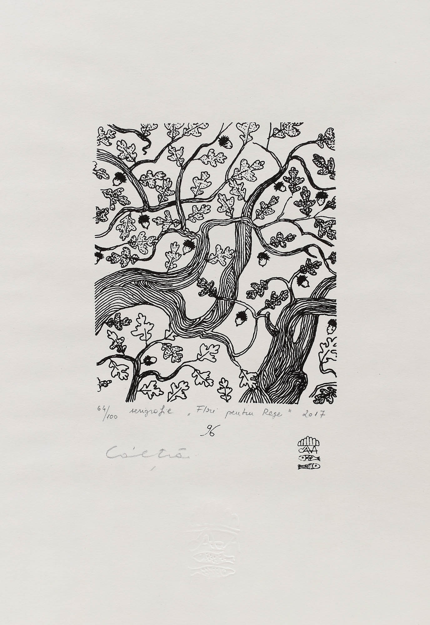 semnat, datat, intitulat și numerotat central jos, în creion, "Câlția, 64/100, serigrafie, Flori pentru Rege, 2017"; semnat stânga jos, în creion, "Câlția"; semnat dreapta jos, gravat, în monogramă, "Câlția"