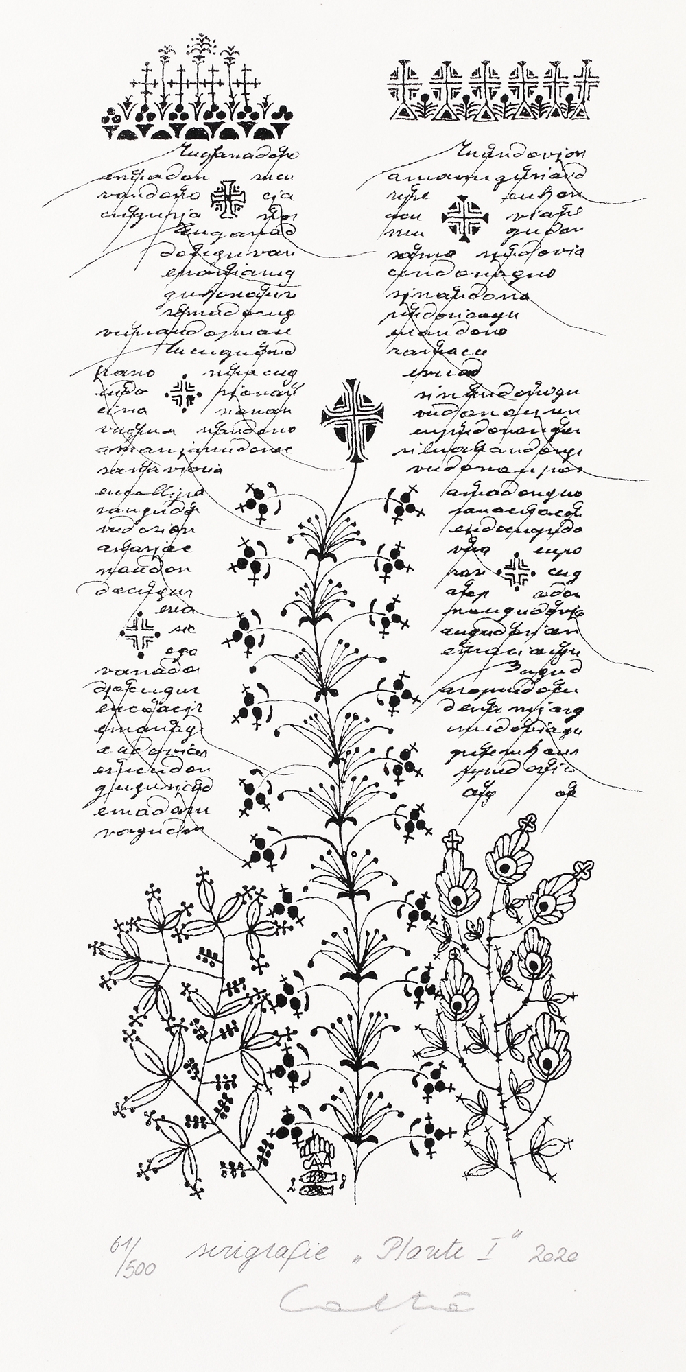 semnat, datat, intitulat și numerotat central jos, în creion, "Câlția, 2020, Plante I, 61/500"